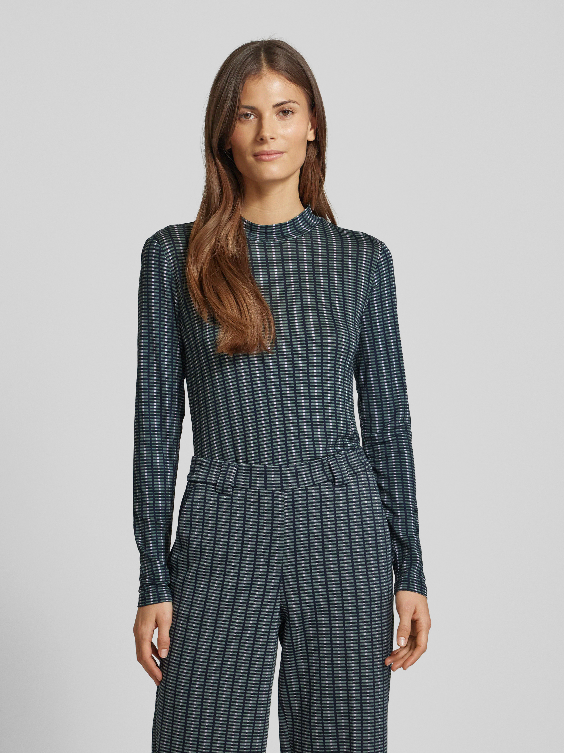 Das Langarmshirt von Tom Tailor aus einem angenehm weichen Viskose-Mix zeigt sich mit einem lebendigen Allover-Muster. Der Shaped Fit schmiegt sich sanft an den Körper und unterstreicht die feminine Silhouette. Ein hochgeschlossener Ausschnitt rundet den stilvollen Look ab.