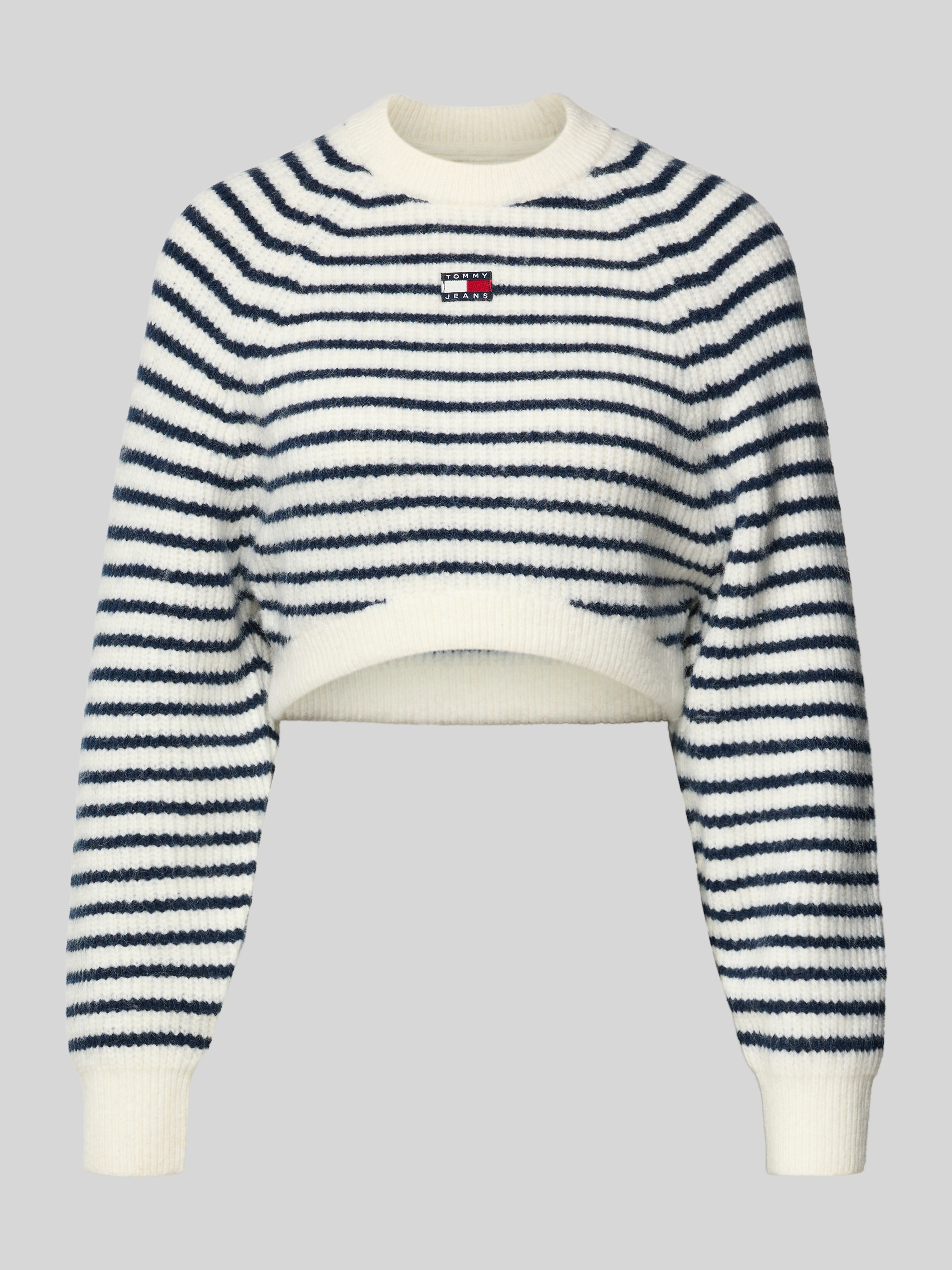 Der Damenpullover von Tommy Jeans präsentiert sich im lockeren Boxy Fit mit gestreiftem Allover-Muster und cropped Länge. Durch den Woll-Anteil erhält der Strick eine angenehme Haptik, während Raglanärmel und leicht überschnittene Schultern Bewegungsfreiheit schaffen. Ein Label Patch rundet das Design dezent ab.