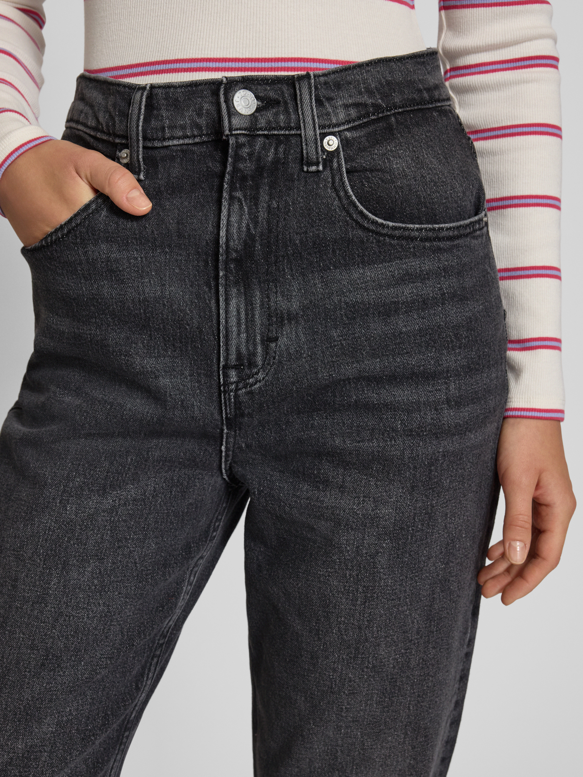 Die Damen Mom Fit Jeans von Tommy Jeans zeigt sich in melierter Optik und lockerer Passform, wodurch sie entspannt und vielseitig wirkt. Durch den hohen Bund entsteht ein angenehmes Tragegefühl, das den Alltag angenehm begleitet. Der Baumwoll-Mix verleiht dem Denim Strapazierfähigkeit und einen weichen Griff.