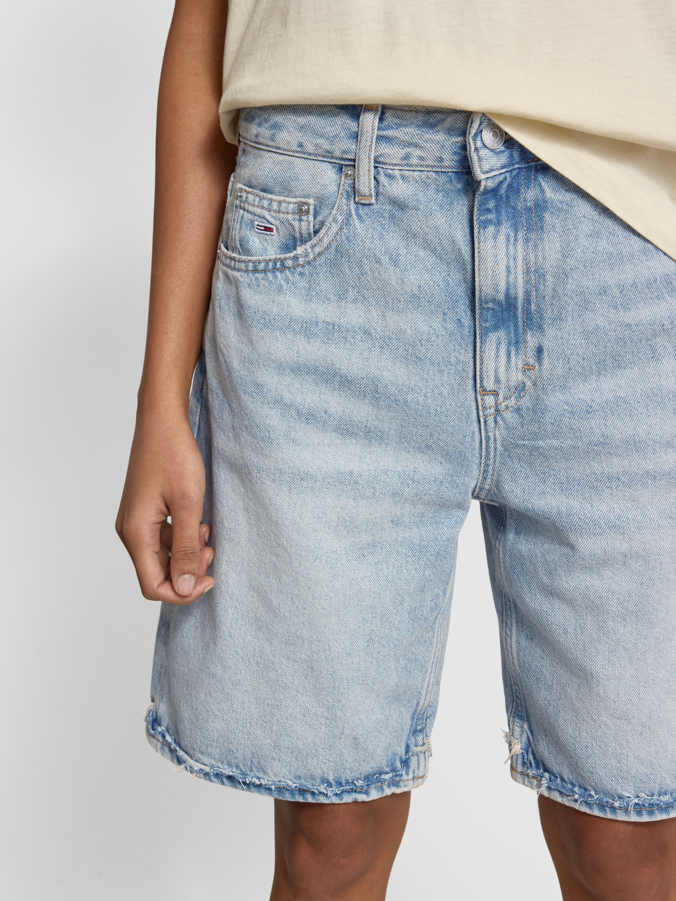 Die Damen Bermudas von Tommy Jeans, Modell 'Mia', zeichnen sich durch ihren entspannten Relaxed Fit aus und bieten dank des Baumwoll-Lyocell-Mix einen angenehmen Tragekomfort. Das melierte Denim-Design sorgt für eine lässige Optik, während das 5-Pocket-Design praktische Funktionalität ermöglicht. Ein dezentes Logo-Stitching verleiht dem Modell einen subtilen Markenakzent.