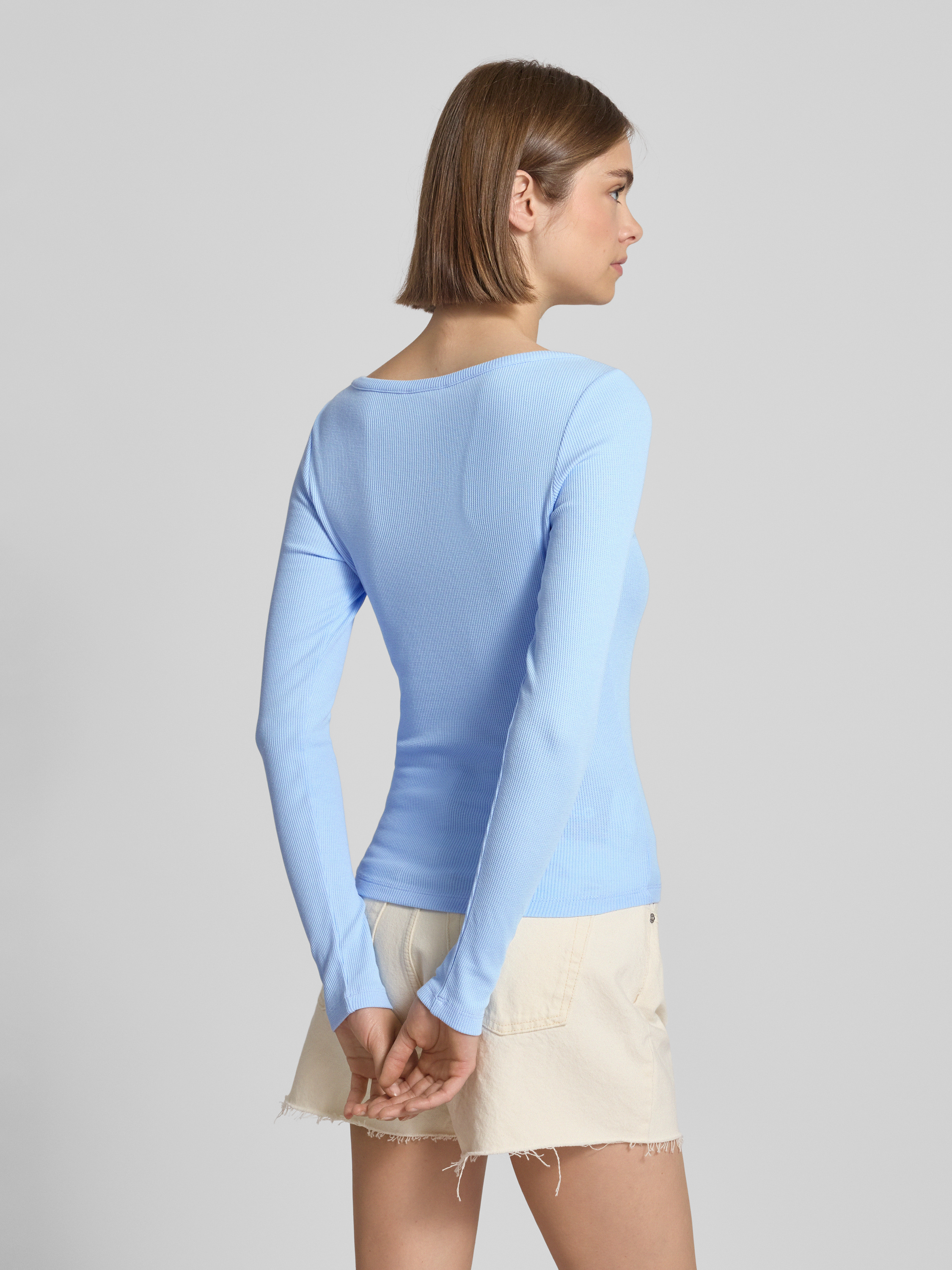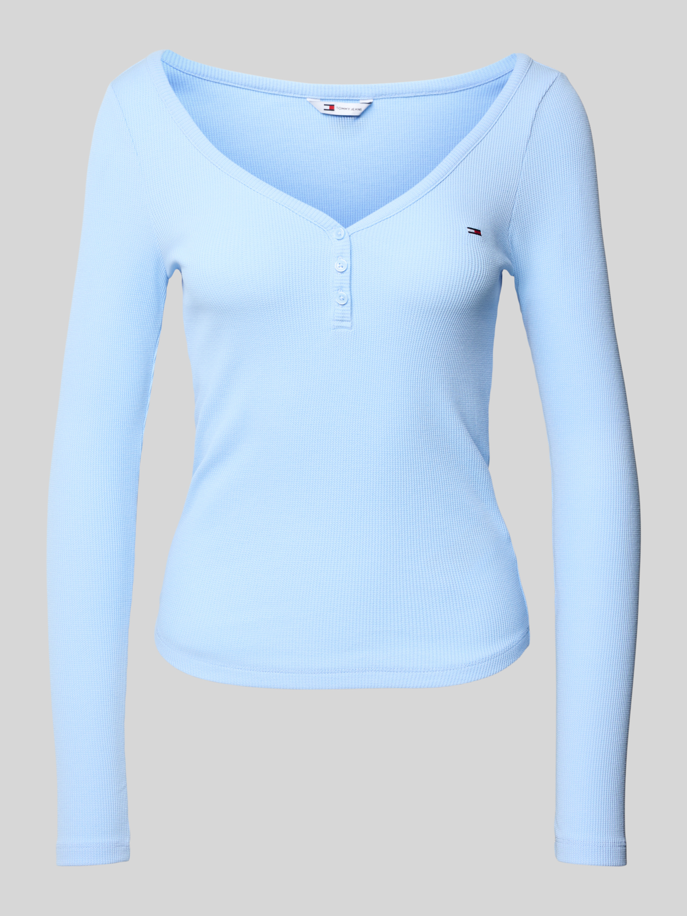 Das Damen Langarmshirt von Tommy Jeans kombiniert ein stilvolles Allover-Muster mit einem figurbetonten Slim Fit, das eine vorteilhafte Silhouette schafft. Der V-Ausschnitt sorgt für ein elegantes Erscheinungsbild, während der angenehme Baumwoll-Mix hohen Tragekomfort für den Alltag bietet.