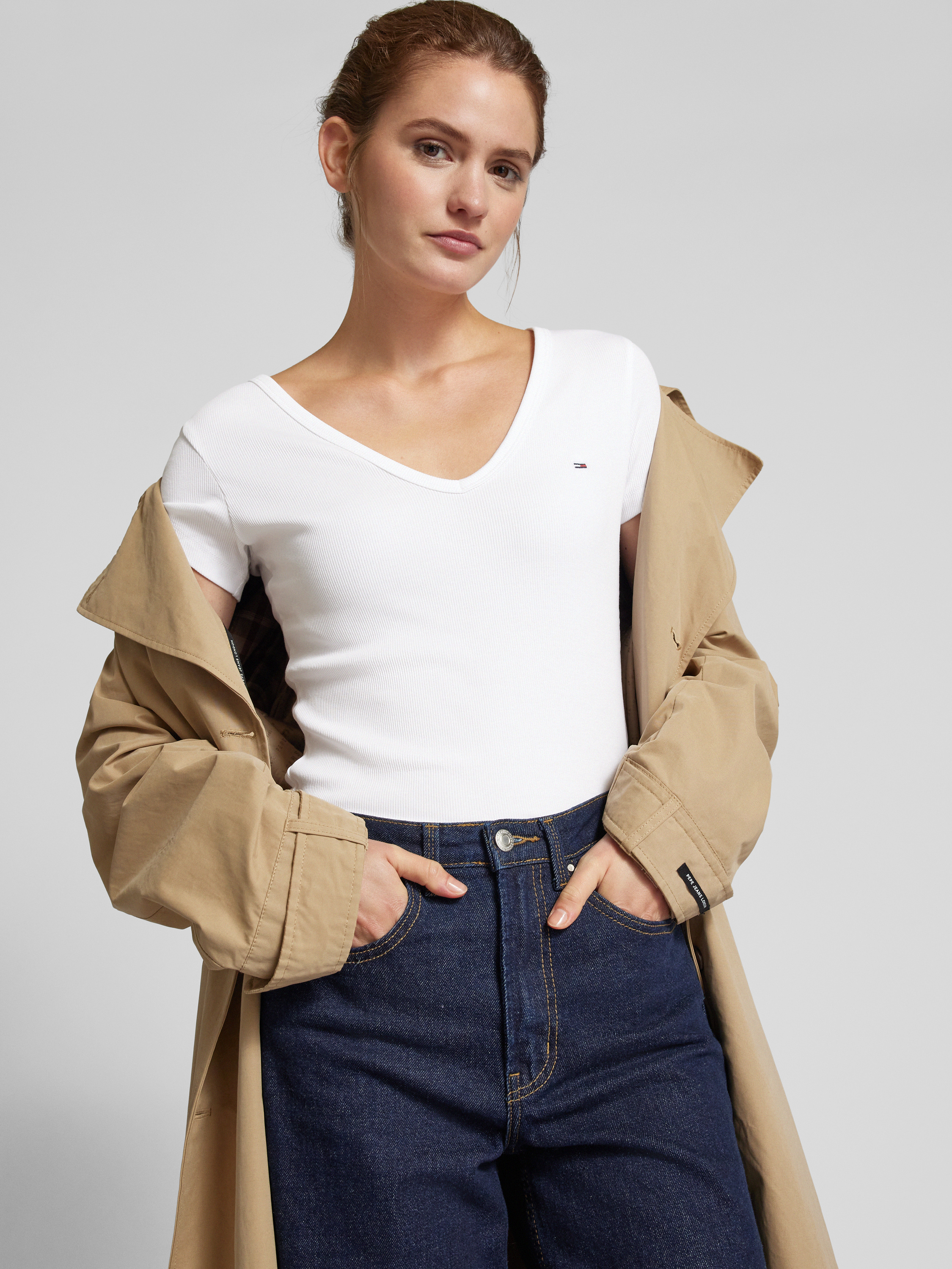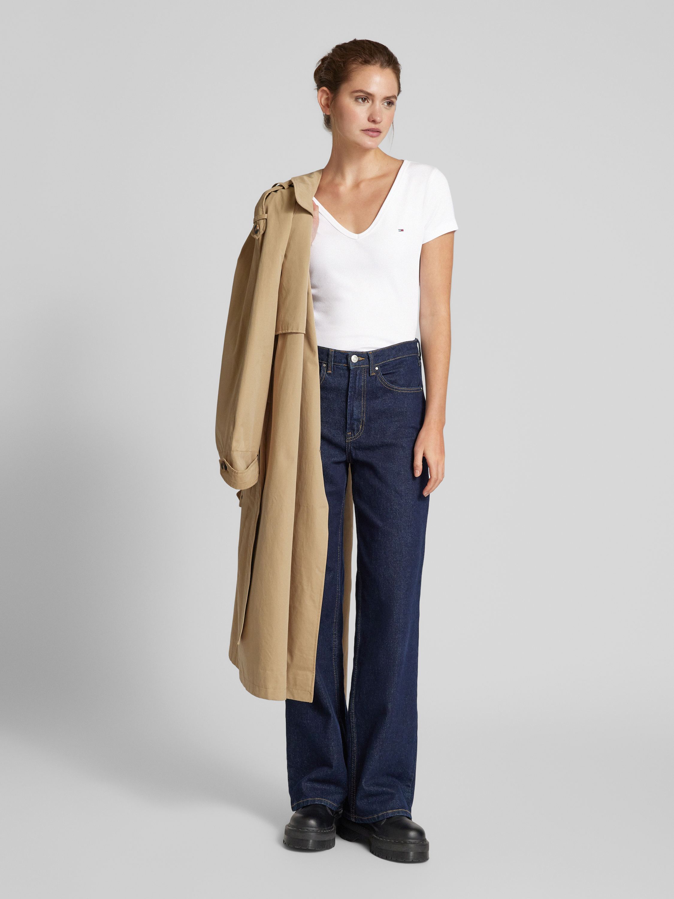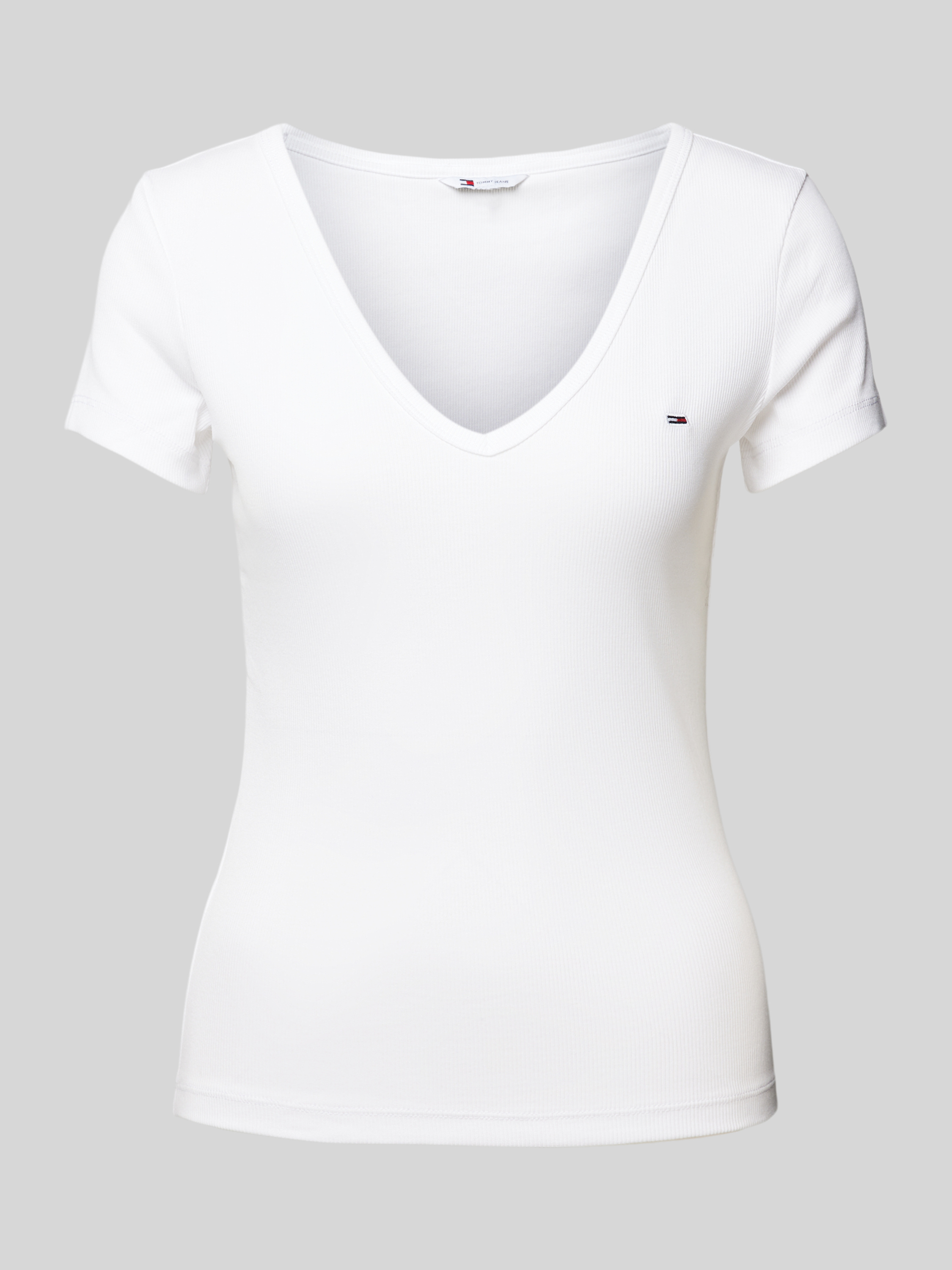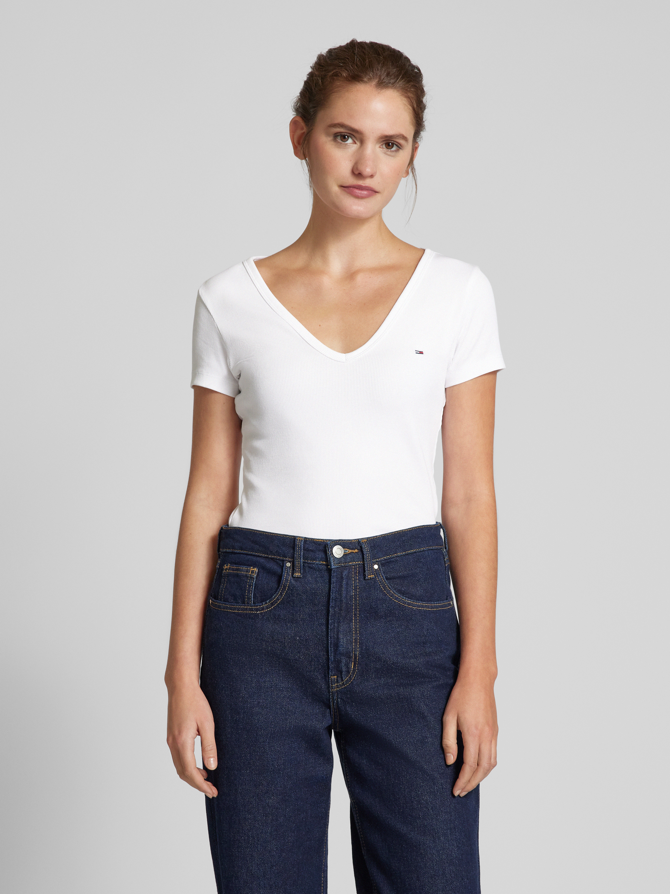 Das Tommy Hilfiger Slim Fit T-Shirt mit V-Ausschnitt vereint eleganten Stil und angenehmen Tragekomfort durch seinen Baumwoll-Mix mit Stretch-Anteil. Der schmale Schnitt passt sich geschmeidig der Figur an, während das dezente Logo-Stitching einen Hauch von Raffinesse verleiht. Ideal für vielseitige Outfit-Kombinationen.