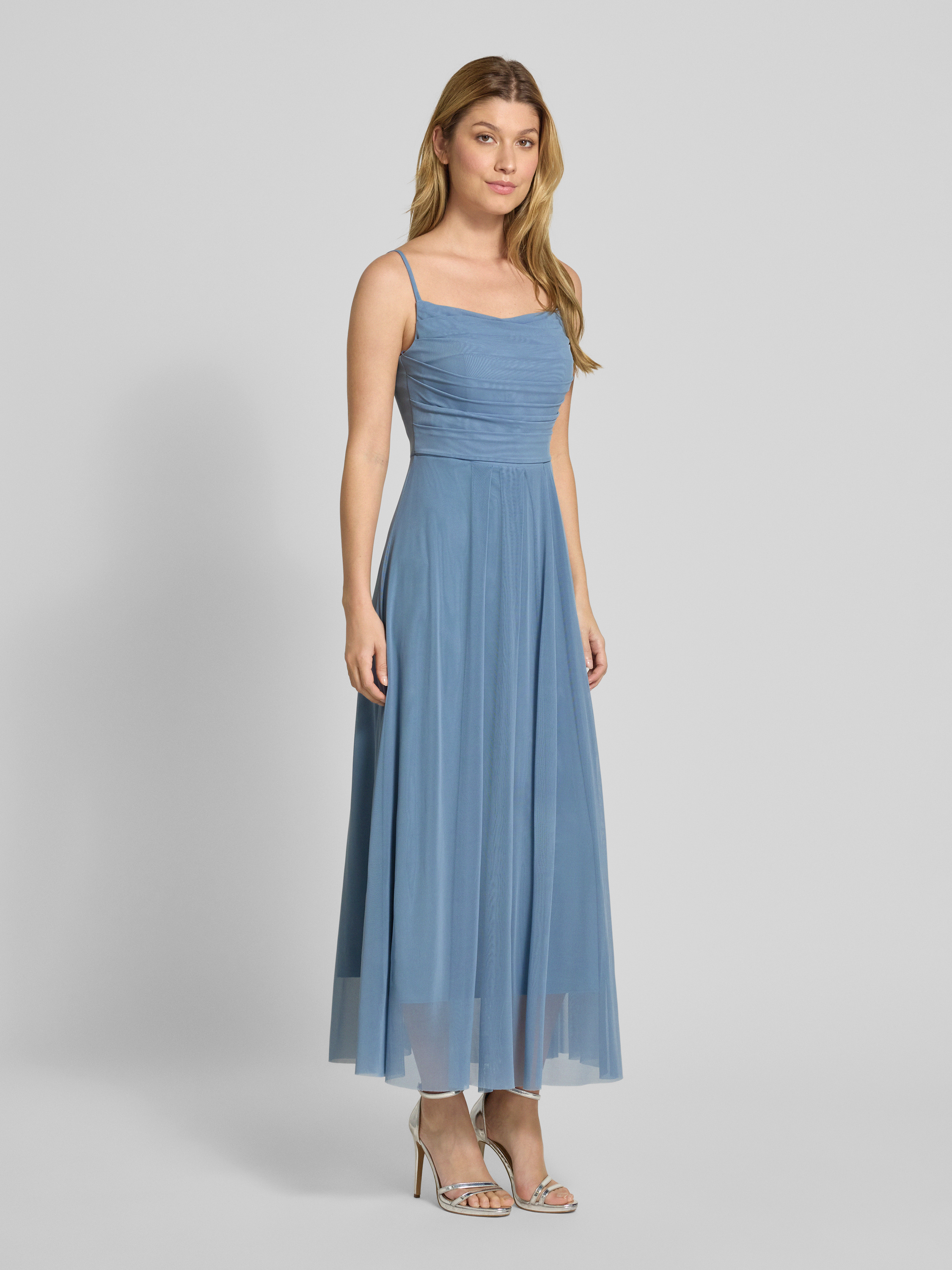 Das Cocktailkleid von TROYDEN COLLECTION vereint feminine Eleganz mit einem raffinierten taillierten Schnitt. Der fließende Tüll und die zarten Spaghettiträger sorgen für eine ansprechende Silhouette, während die Raffungen dem Midikleid eine besondere Note verleihen. Ideal für festliche Anlässe.