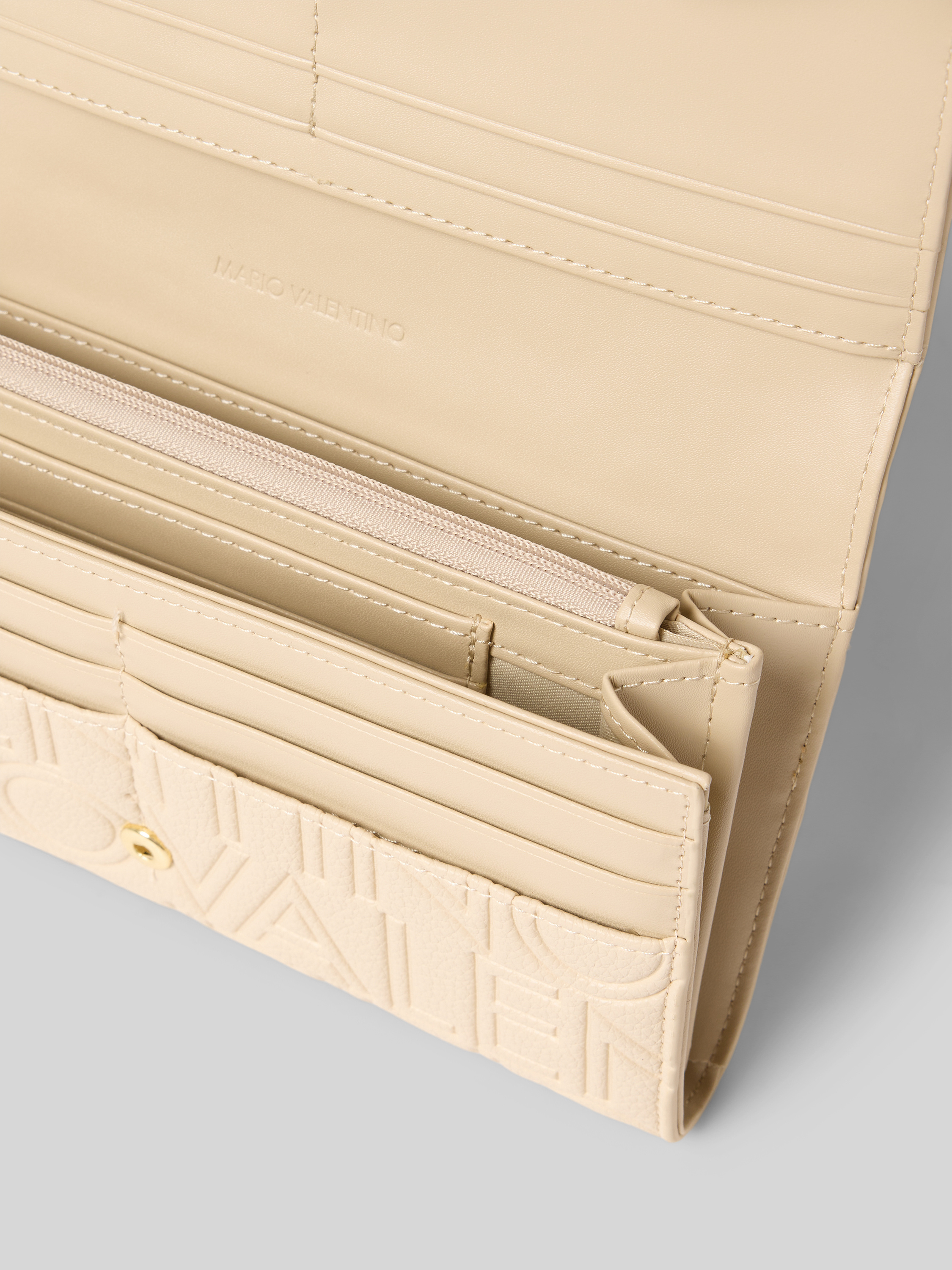 Das Damen Portemonnaie von VALENTINO BAGS im Modell 'PANSY' vereint ein übersichtliches Hauptfach mit einem praktischen Überschlag und klassischem Druckknopfverschluss. Das charakteristische Logo-Muster und die Label-Applikation setzen dezente Akzente, die für einen stimmigen Look sorgen. Durchdachte Details erleichtern den Alltag und schaffen Struktur für wichtige Utensilien.