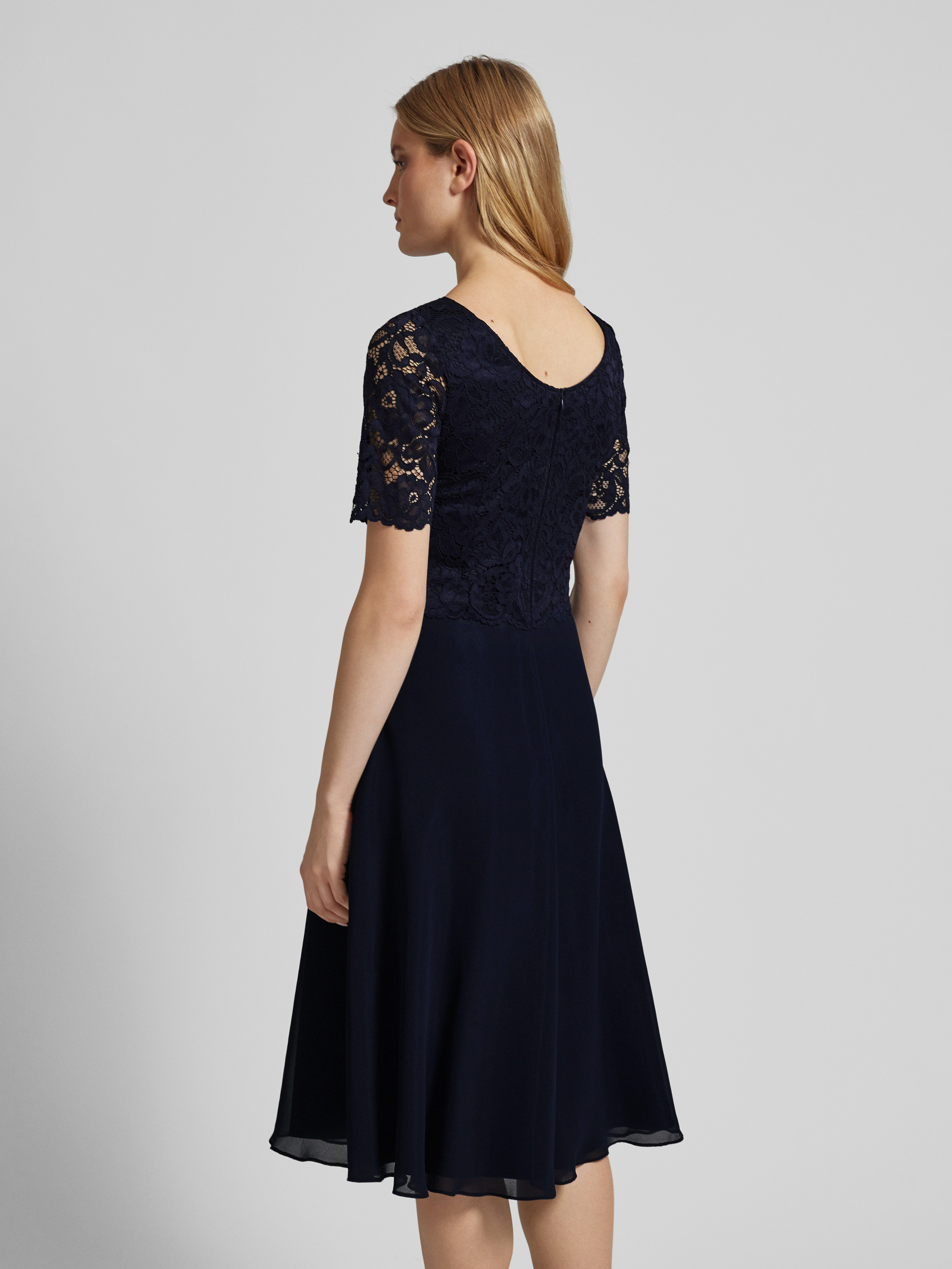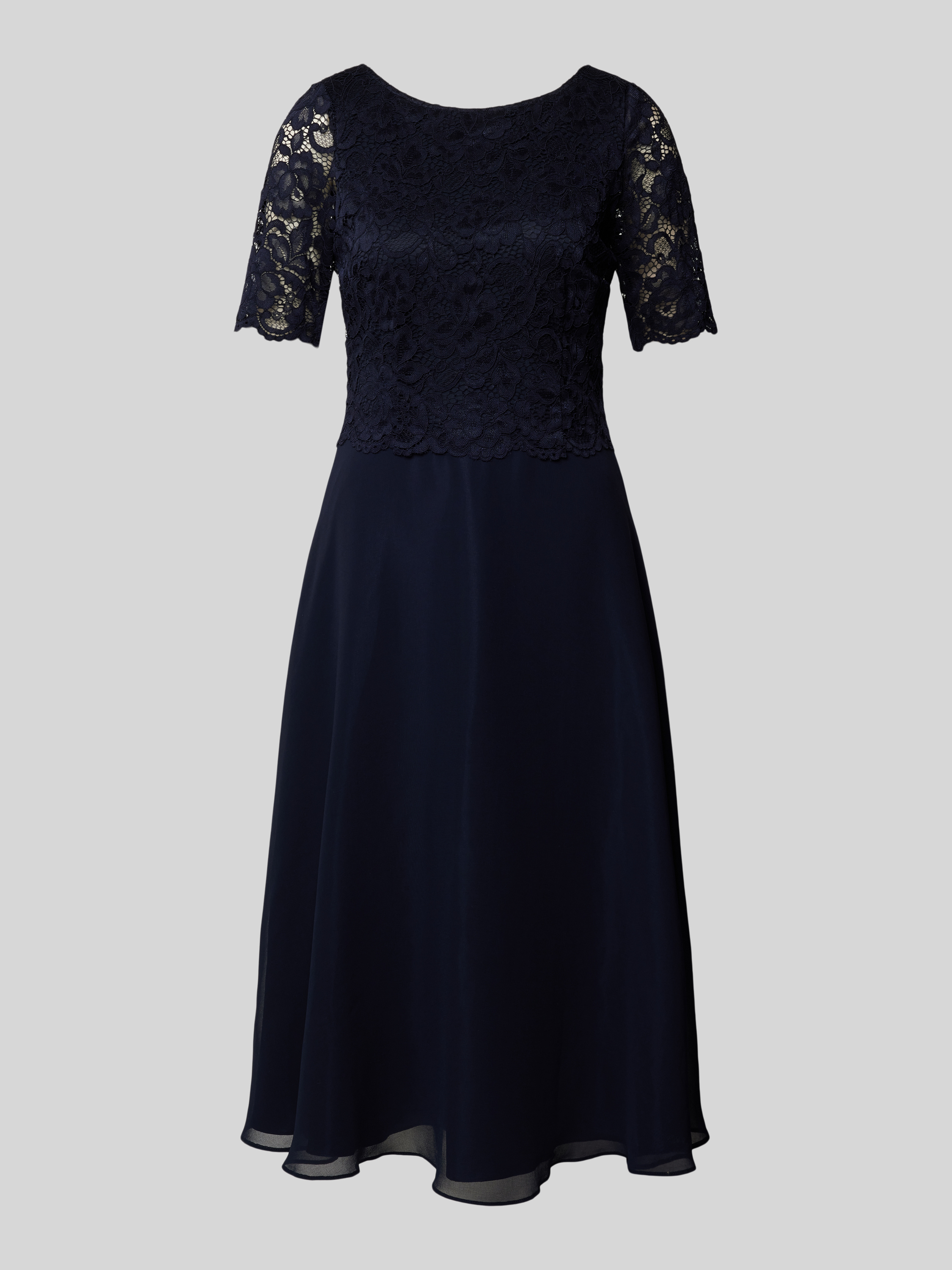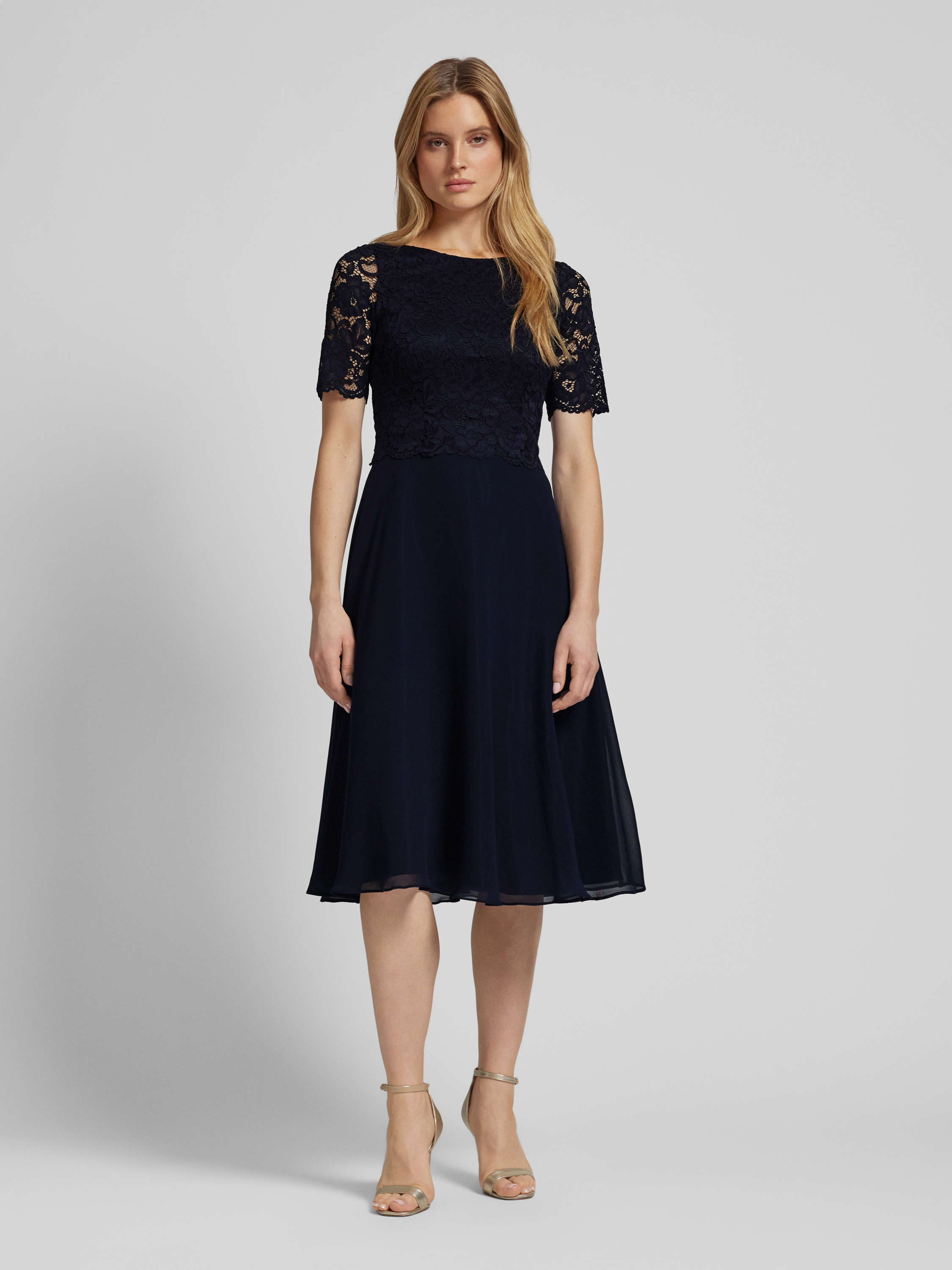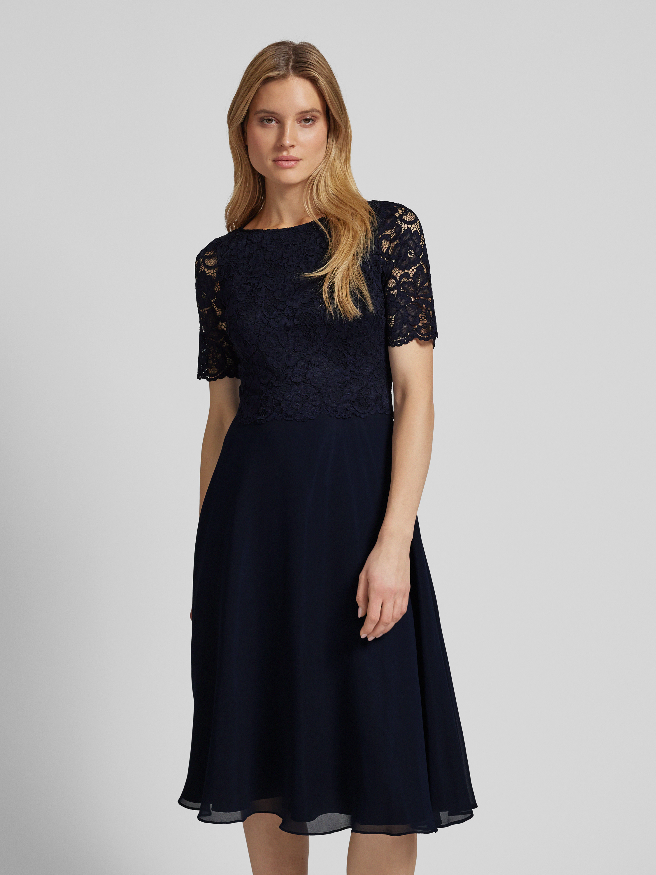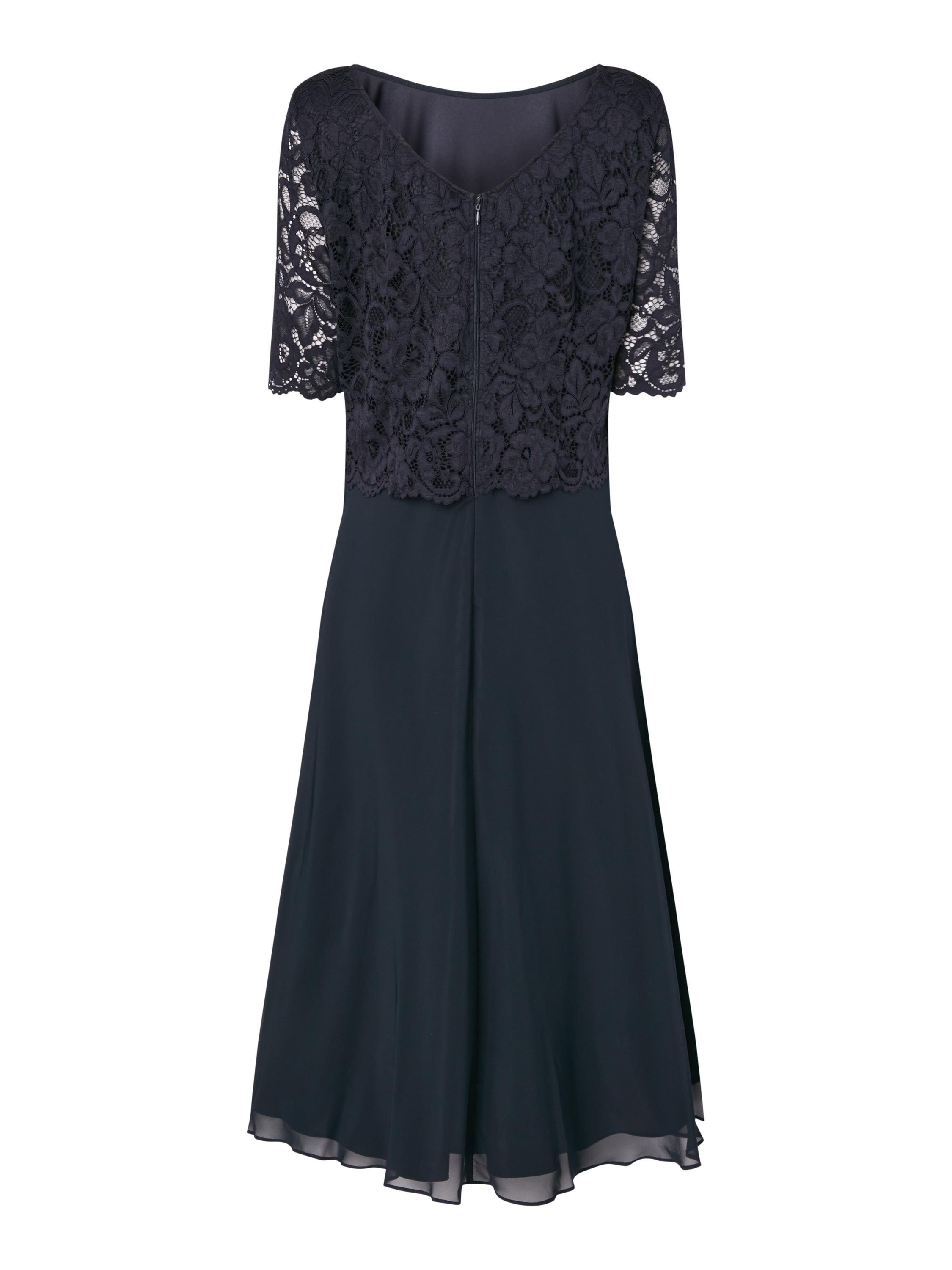 Das Cocktailkleid von Vera Mont präsentiert sich in einem eleganten, taillierten Schnitt, der durch den hochwertigen Material-Mix mit Stretch-Anteil für eine angenehme Passform sorgt. Der zarte Spitzenbesatz verleiht dem unifarbenen Design eine besondere Note, während das blickdichte Unterkleid für ein sicheres Tragegefühl sorgt. Ideal für festliche Anlässe und stilvolle Abende.