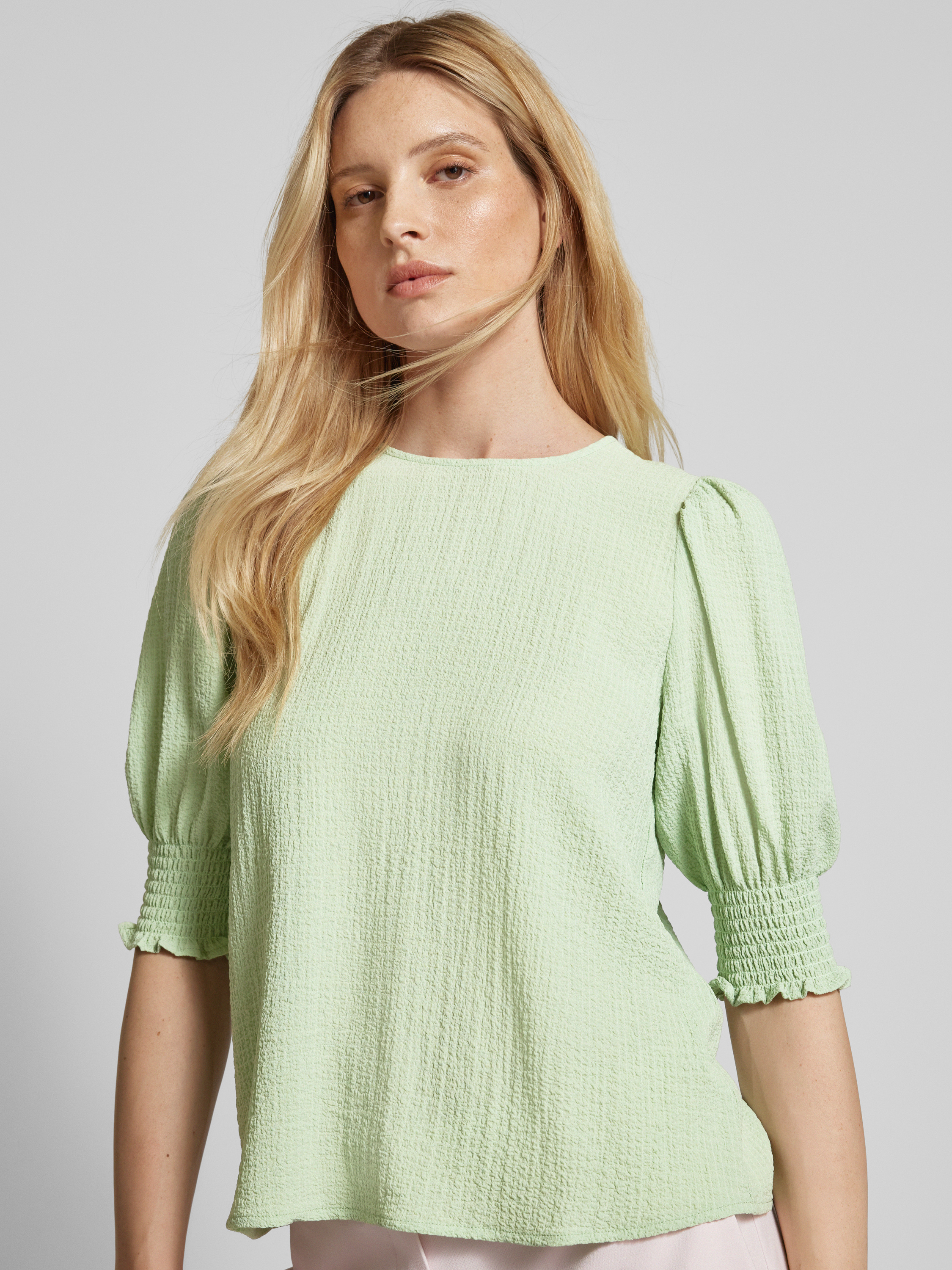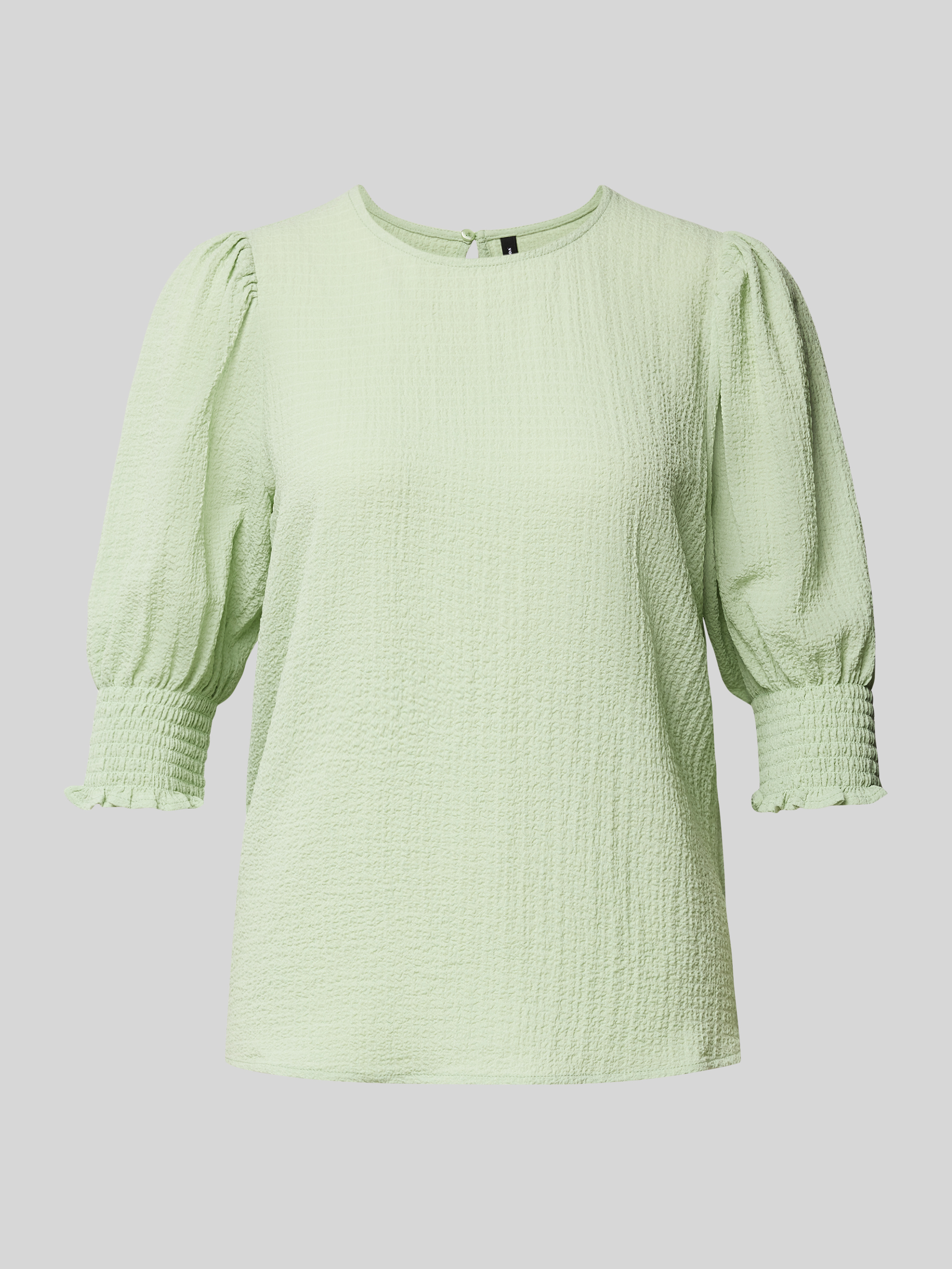 Die Bluse mit Smok-Details Modell 'NINA' von VERO MODA zeichnet sich durch einen geraden Schnitt und einen Rundhalsausschnitt aus, die in Kombination mit dem feinen Strukturmuster eine elegante Note verleihen. Die halblangen Ärmel ergänzen das luftige Design und machen sie zu einem vielseitigen Begleiter für verschiedene Anlässe. Dank der dezenten Smok-Details entsteht ein subtiler Akzent, der das Gesamtbild harmonisch abrundet.