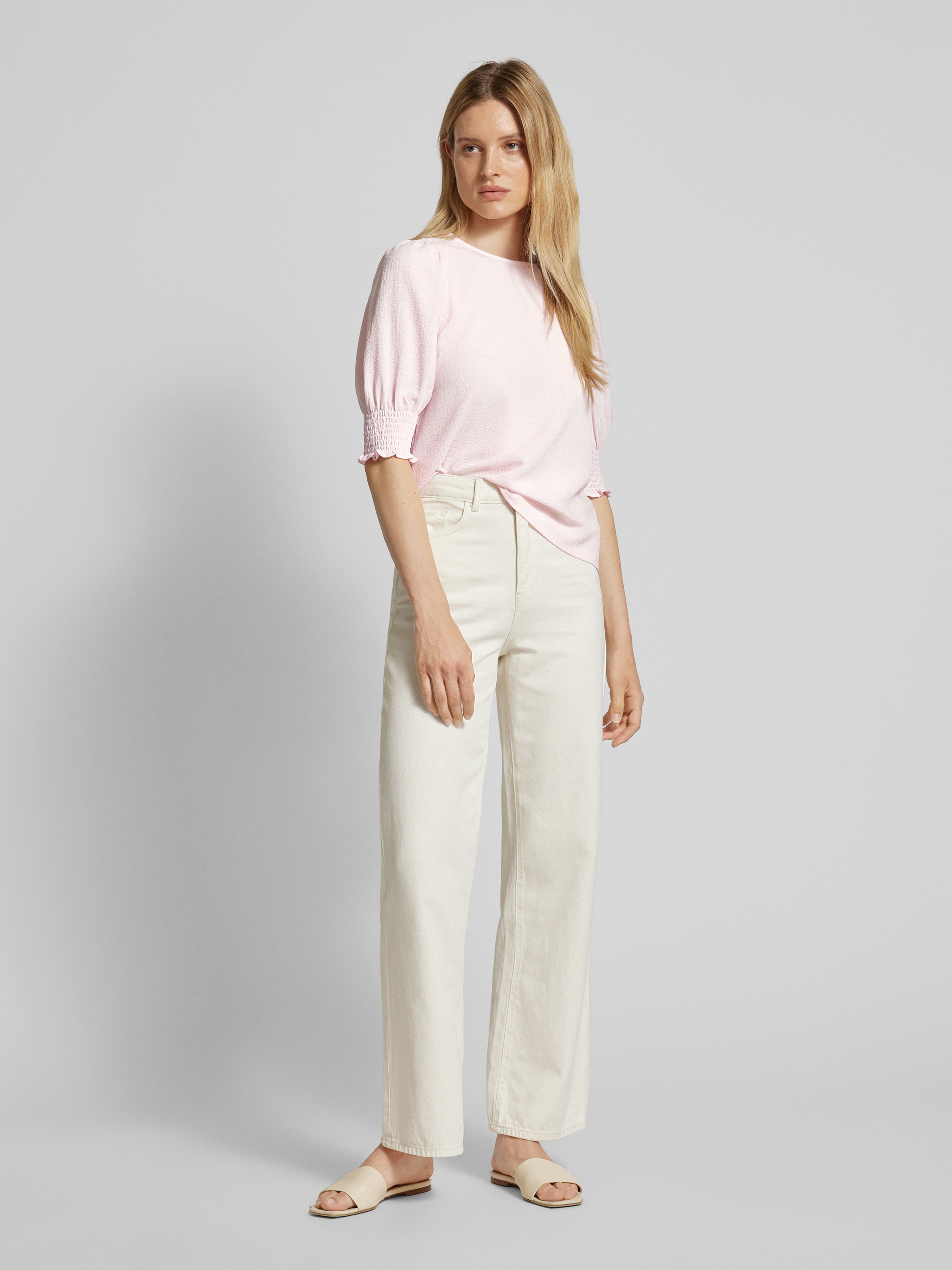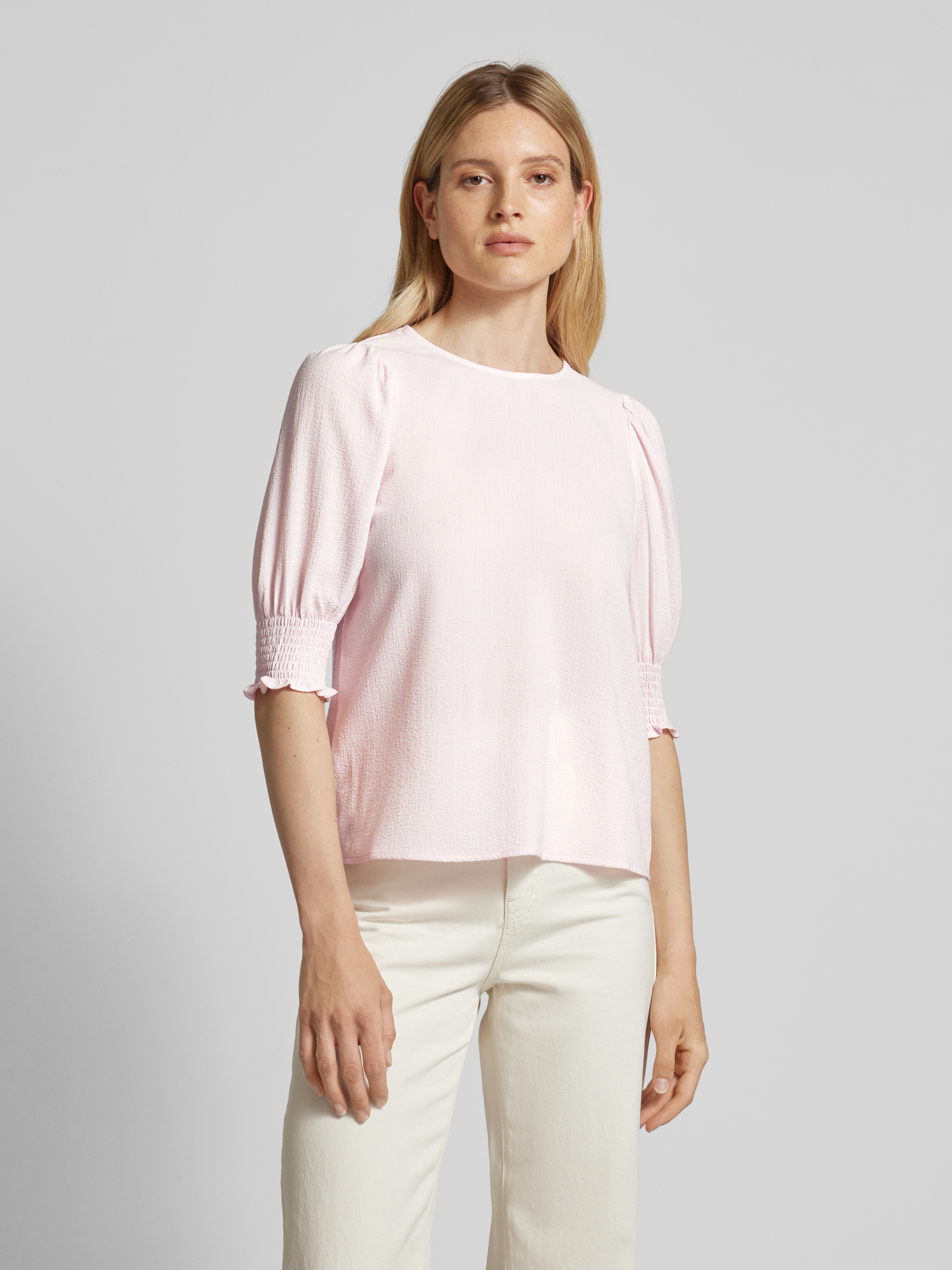 Die Bluse mit Smok-Details Modell 'NINA' von VERO MODA zeichnet sich durch einen geraden Schnitt und einen Rundhalsausschnitt aus, die in Kombination mit dem feinen Strukturmuster eine elegante Note verleihen. Die halblangen Ärmel ergänzen das luftige Design und machen sie zu einem vielseitigen Begleiter für verschiedene Anlässe. Dank der dezenten Smok-Details entsteht ein subtiler Akzent, der das Gesamtbild harmonisch abrundet.