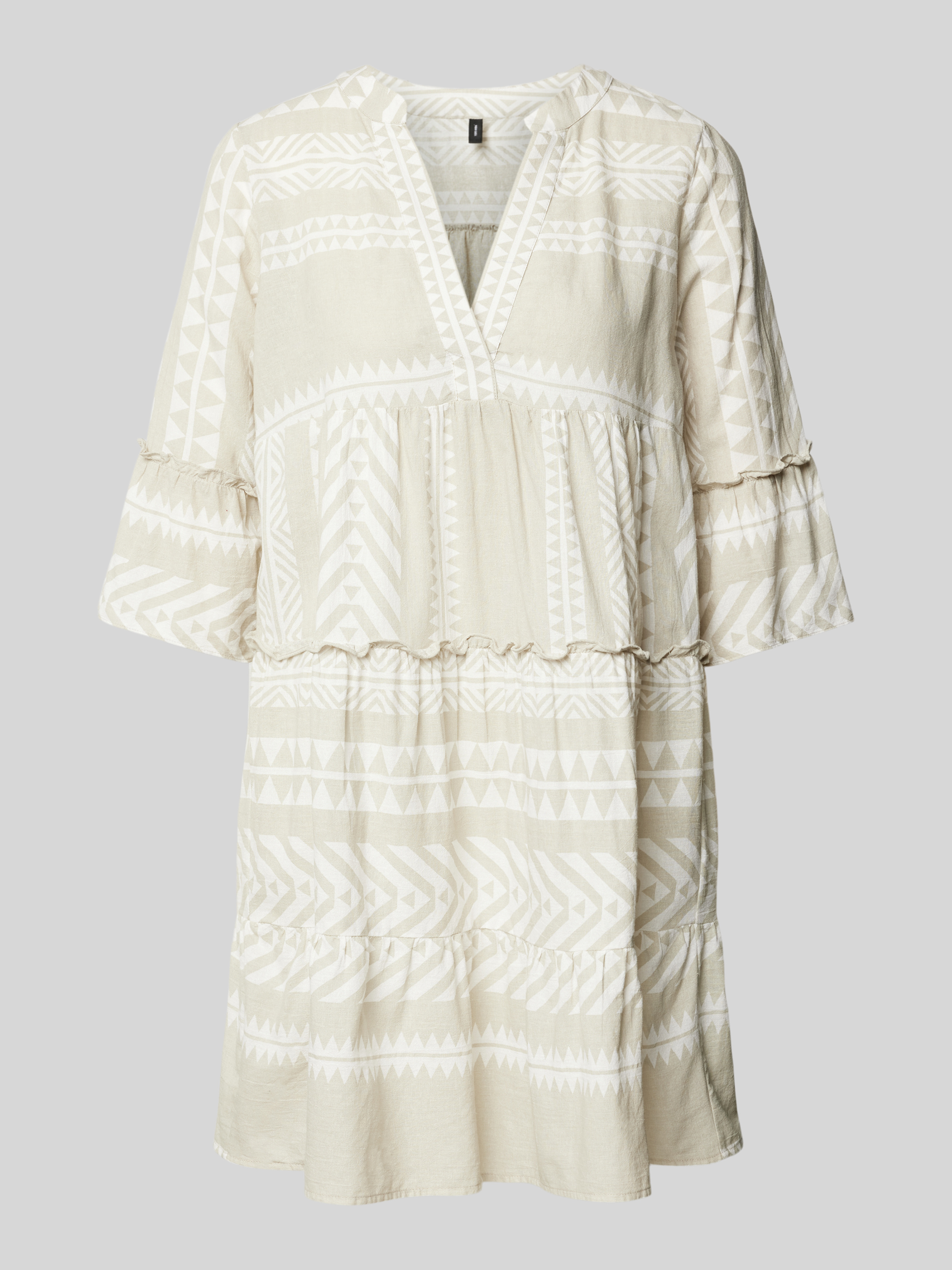 Das figurumspielende Tunikakleid 'Dicthe' von Vero Moda kombiniert ein lebendiges Allover-Muster mit einem luftigen Design aus reiner Baumwolle. Der V-Ausschnitt und die 3/4-Ärmel mit Volantabschluss sorgen für eine bequeme Passform. Ideal für entspannte Sommertage und vielseitige Stylingmöglichkeiten.