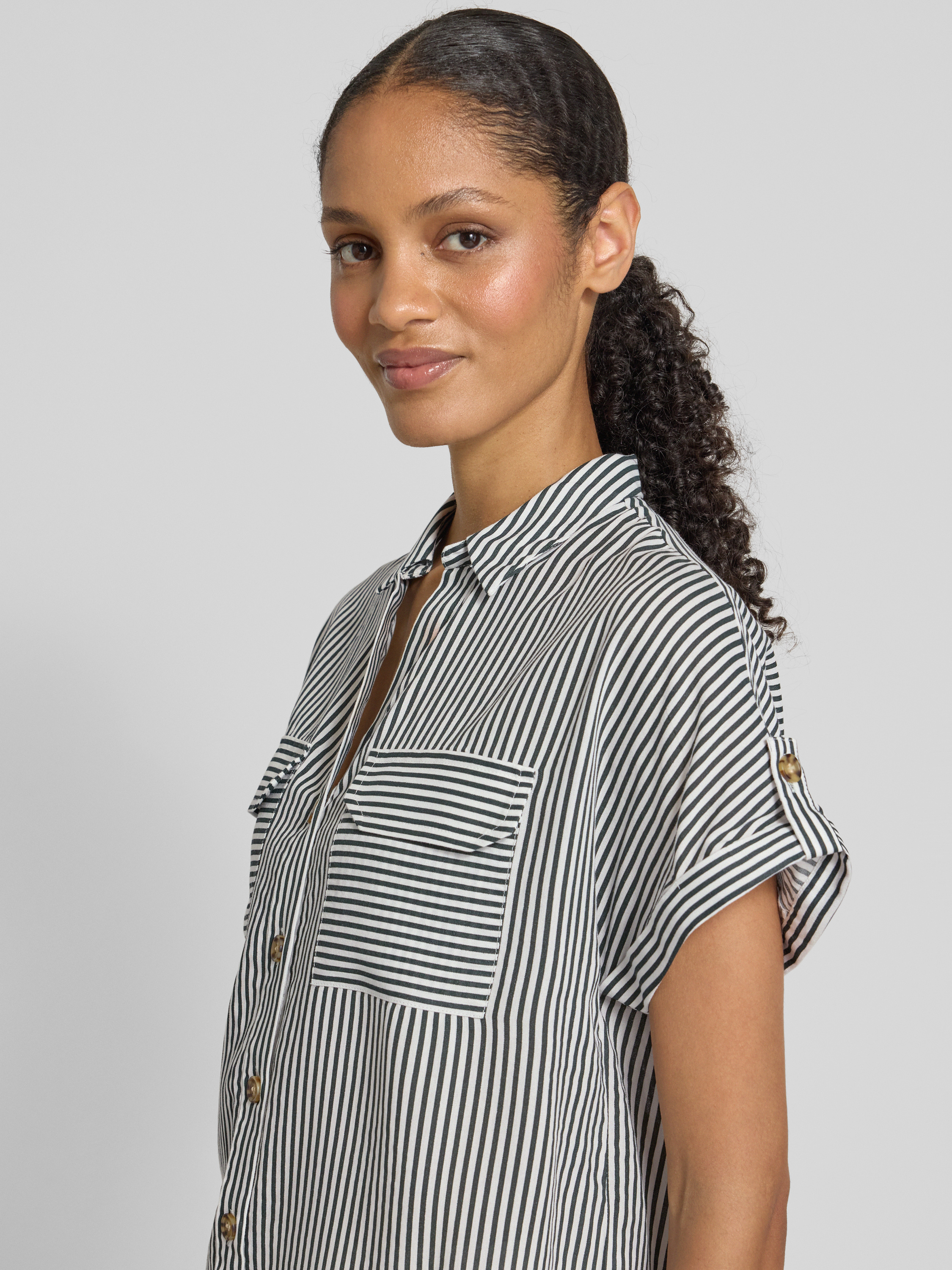 Die Regular Fit Hemdbluse von Vero Moda, Modell 'Bumpy', aus reiner Viskose bietet durch ihre feine Webstruktur einen angenehmen Tragekomfort. Der V-Ausschnitt und das Allover-Muster verleihen der kurzärmeligen Bluse mit fixiertem Umschlag eine dezente Eleganz. Ideal für einen stilvollen Alltagslook.