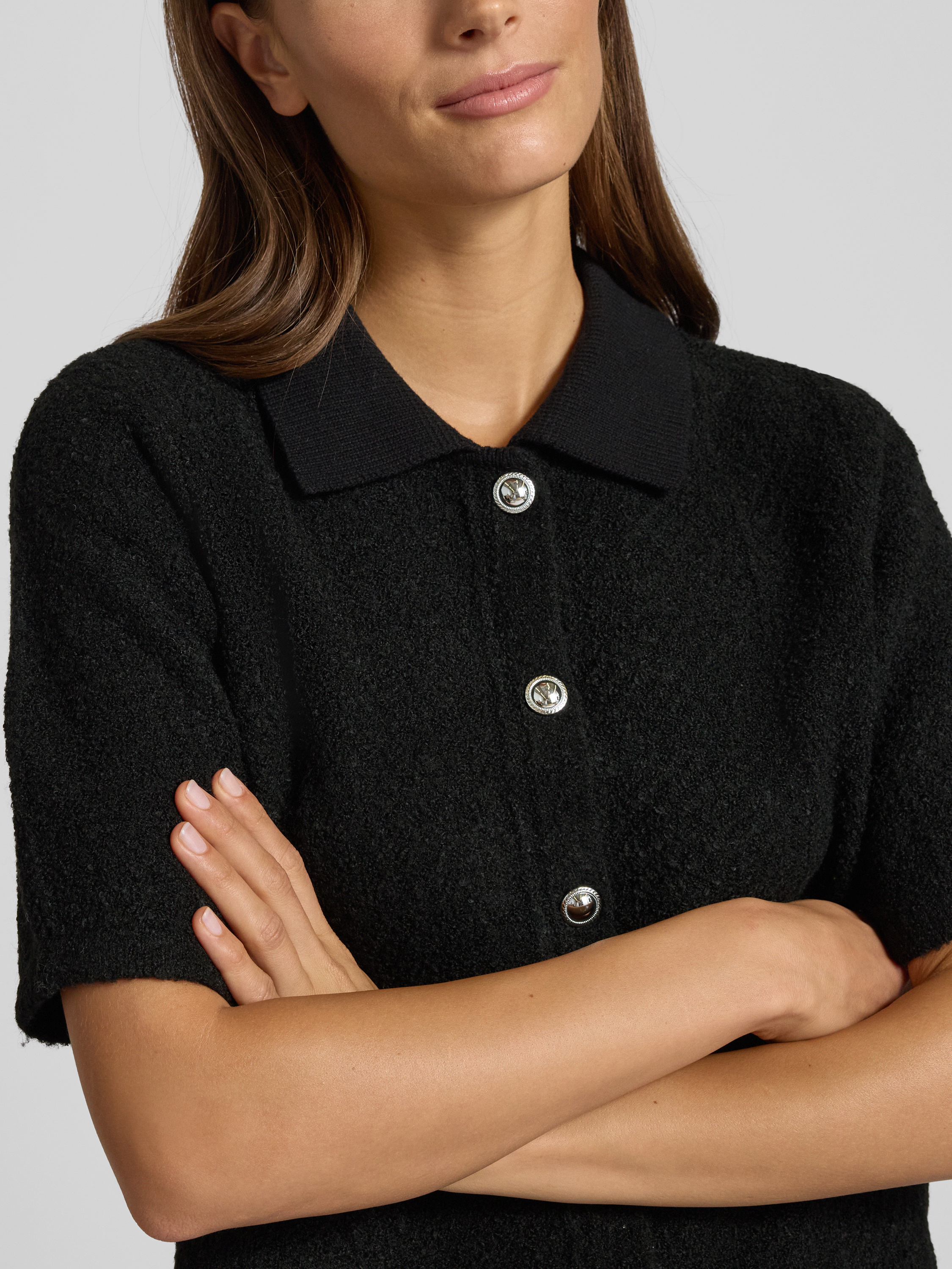 Die Strickjacke DIANA von Vero Moda fällt durch ihre strukturierte, unifarbene Optik und den klassischen Polokragen angenehm auf. Dank Regular Fit und kurzen Ärmeln lässt sie sich vielseitig kombinieren, während dezente Schmuckknöpfe dem Look eine unaufdringliche, feminine Note verleihen. Gerade an wechselhaften Tagen eignet sich diese Variante für unkomplizierte Outfits.