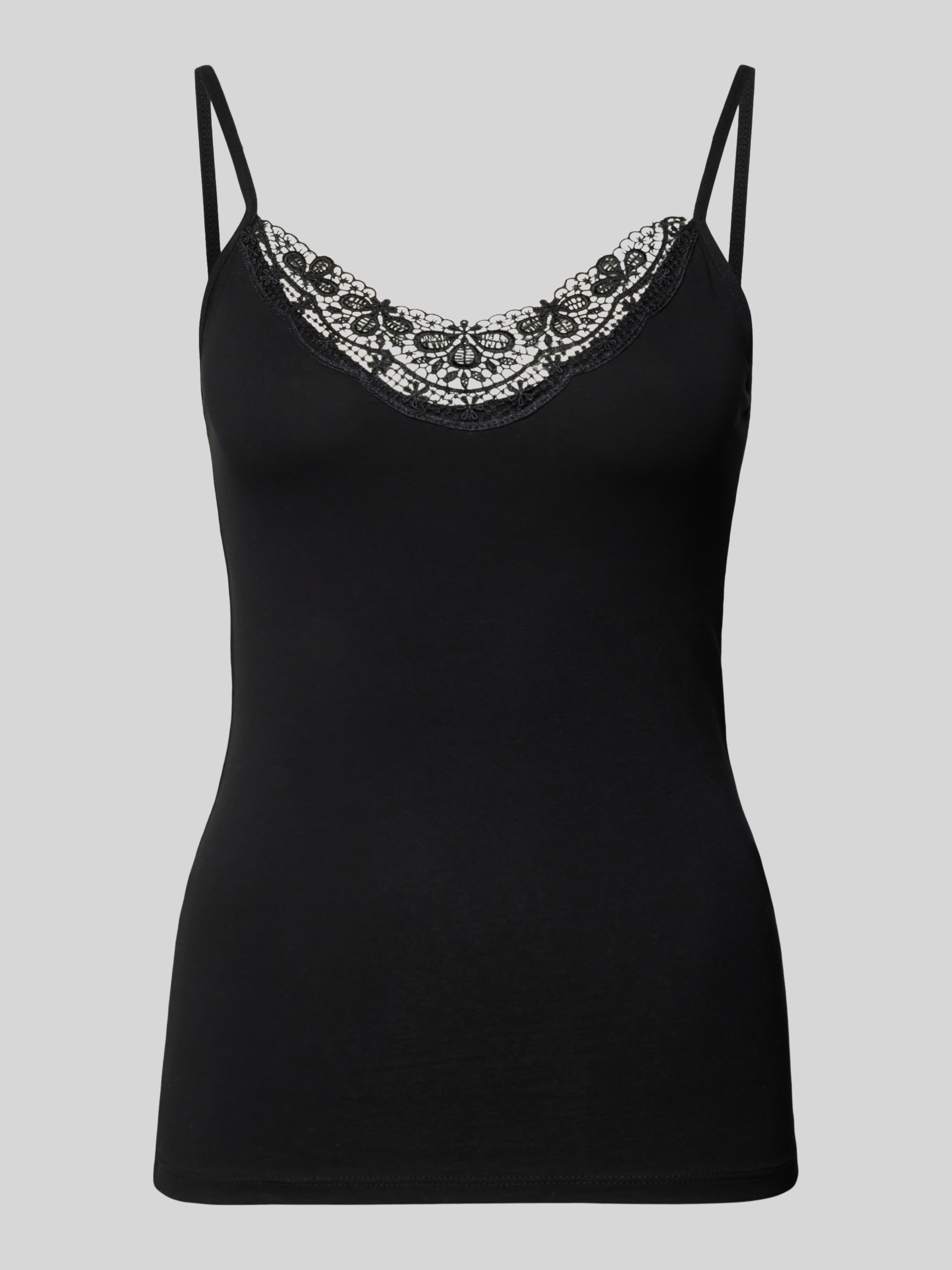 Das Trägertop mit Spitzenbesatz Modell 'INGE' von VERO MODA vereint dank seines Baumwoll-Elasthan-Mixes ein angenehmes Tragegefühl mit einer bequemen Passform. Die zarten Spaghettiträger und der elegante Spitzenbesatz setzen feminine Akzente, die sich vielseitig kombinieren lassen. Ideal für unkomplizierte und stilvolle Outfits.