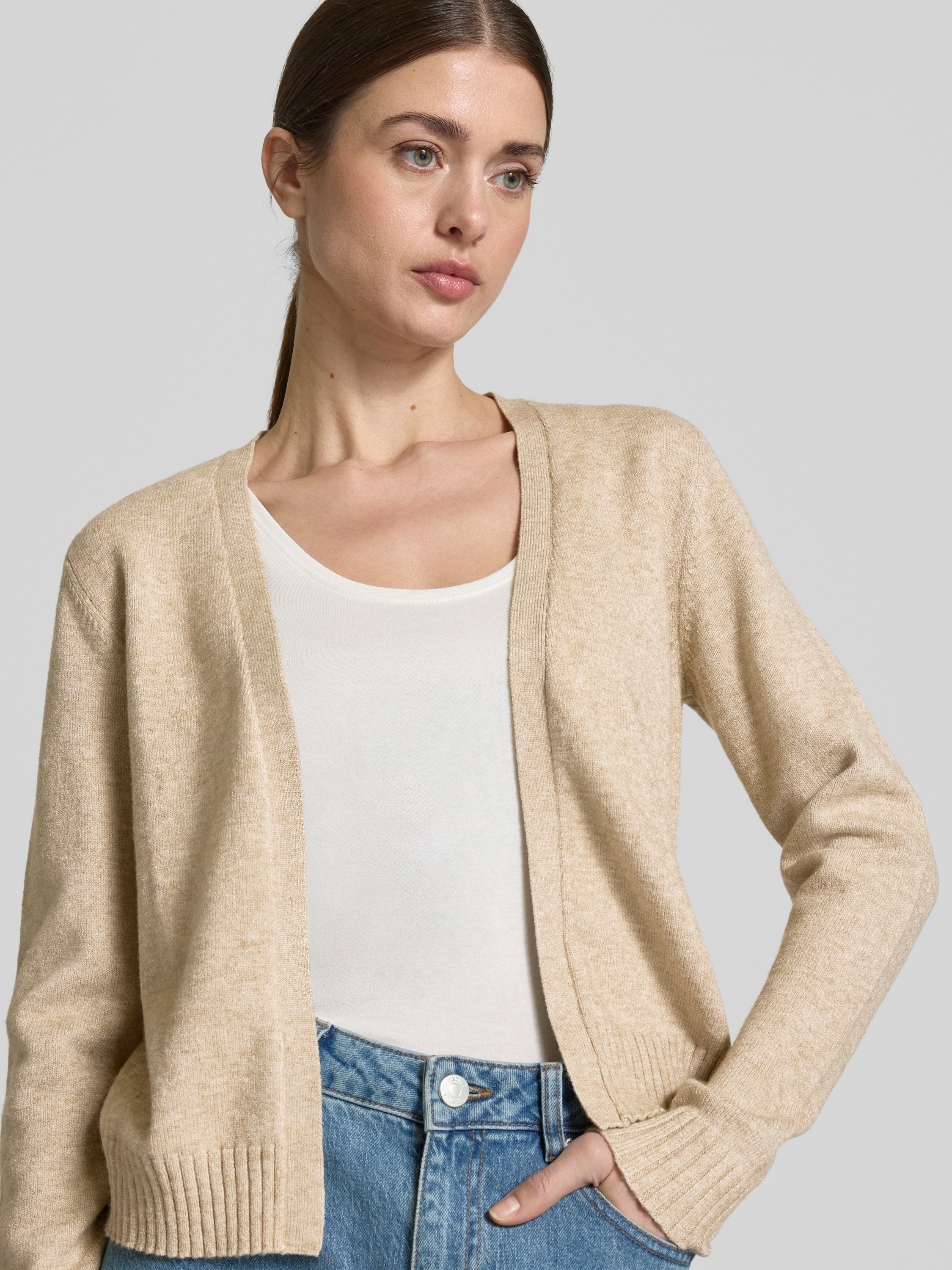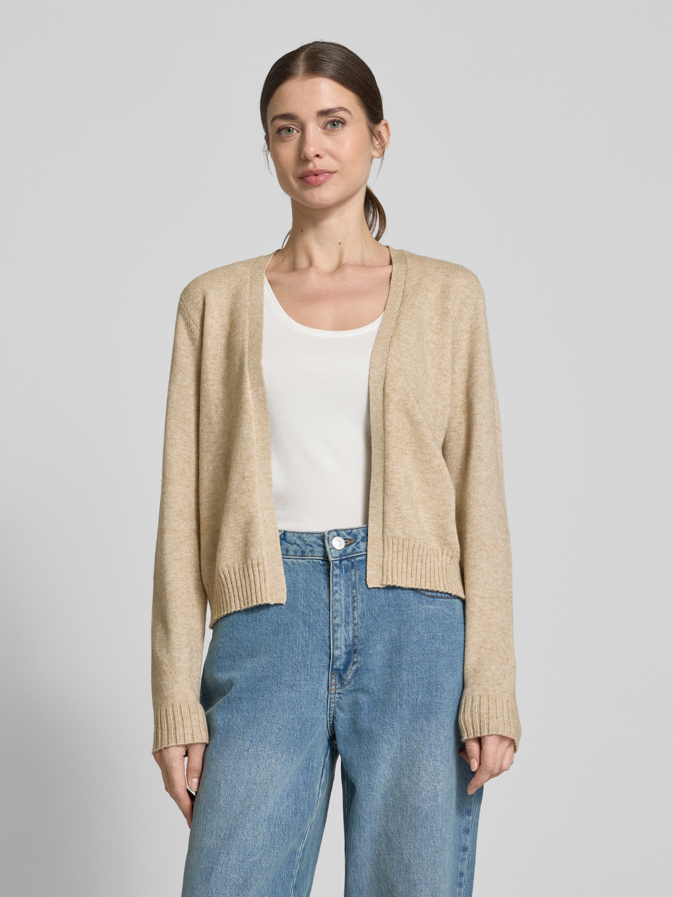 Der Cardigan von VILA aus einem weichen Viskose-Mix kombiniert eine körpernahe Passform mit einer offenen Vorderseite, was Bewegungsfreiheit und Komfort ermöglicht. Die gerippten Abschlüsse verleihen dem Design eine dezente Struktur. Ideal für kühle Abende oder als modisches Layering-Piece.