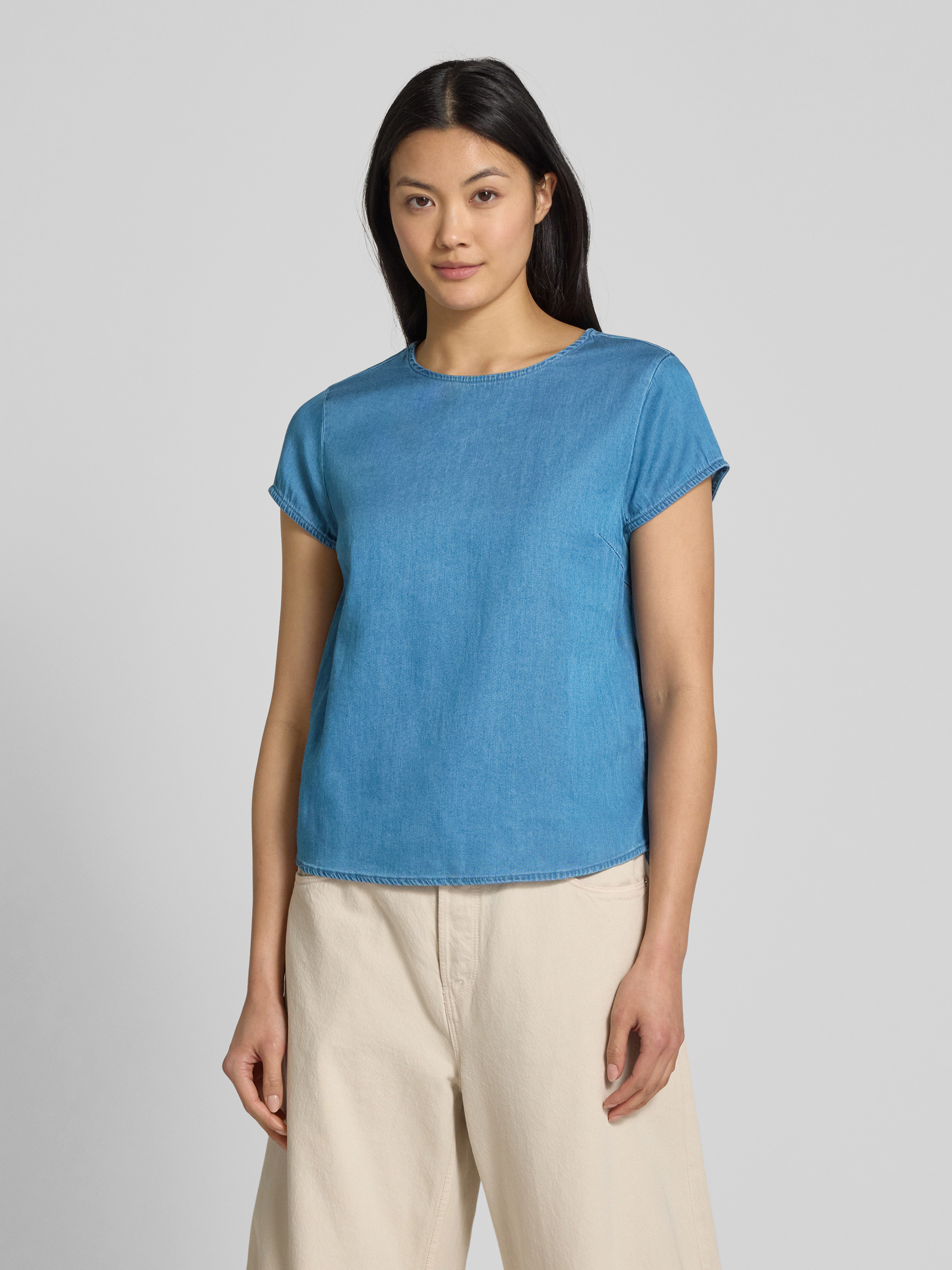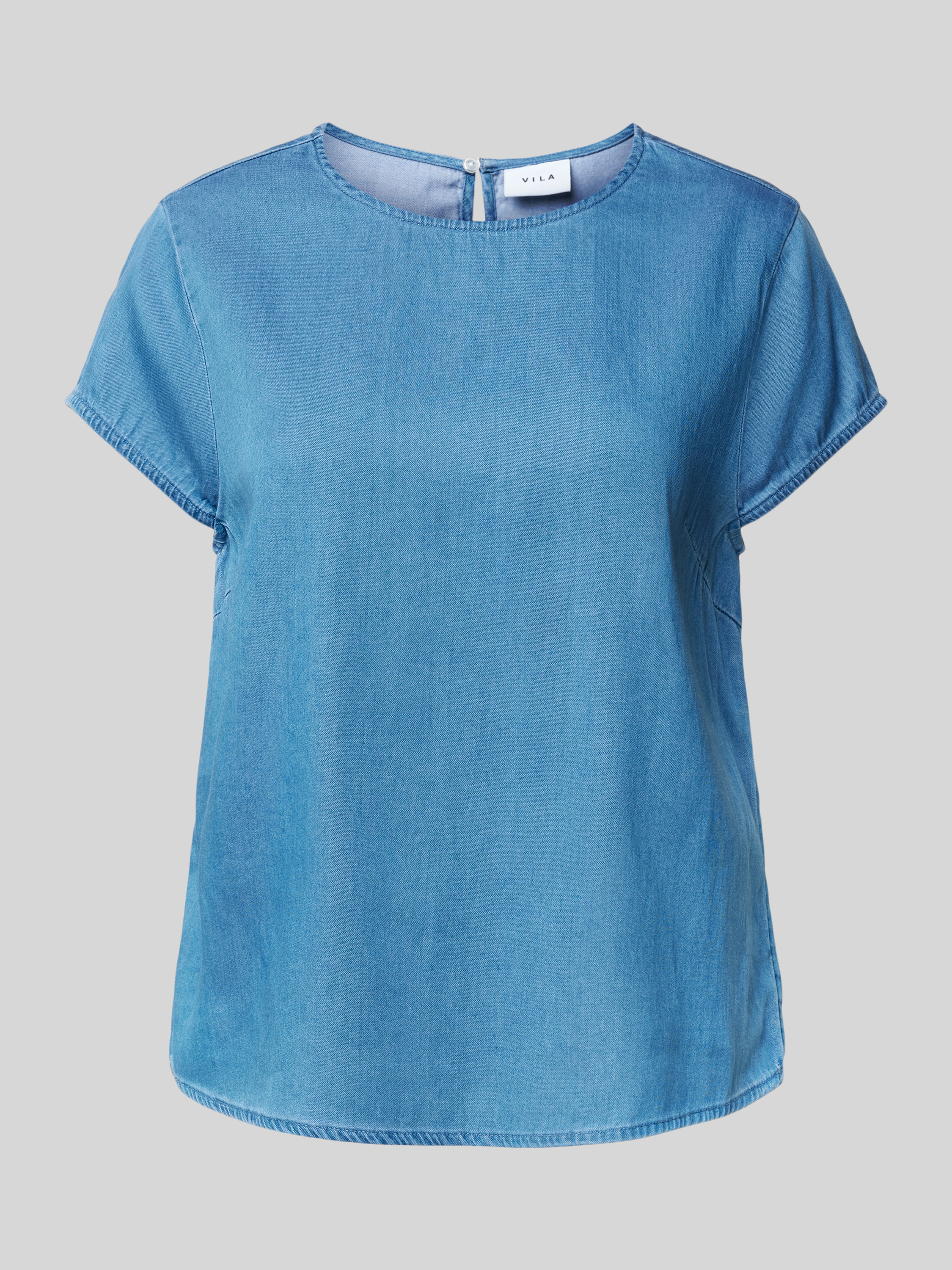 Das Blusenshirt von VILA, Modell 'BISTA', zeichnet sich durch seinen Lyocell-Baumwoll-Mix aus, der für ein angenehmes Tragegefühl sorgt. Der Regular Fit und der Rundhalsausschnitt verleihen ihm eine lässige Eleganz, während der rückseitige Knopfverschluss dezente Akzente setzt. Ideal für vielseitige Kombinationen im Alltag.