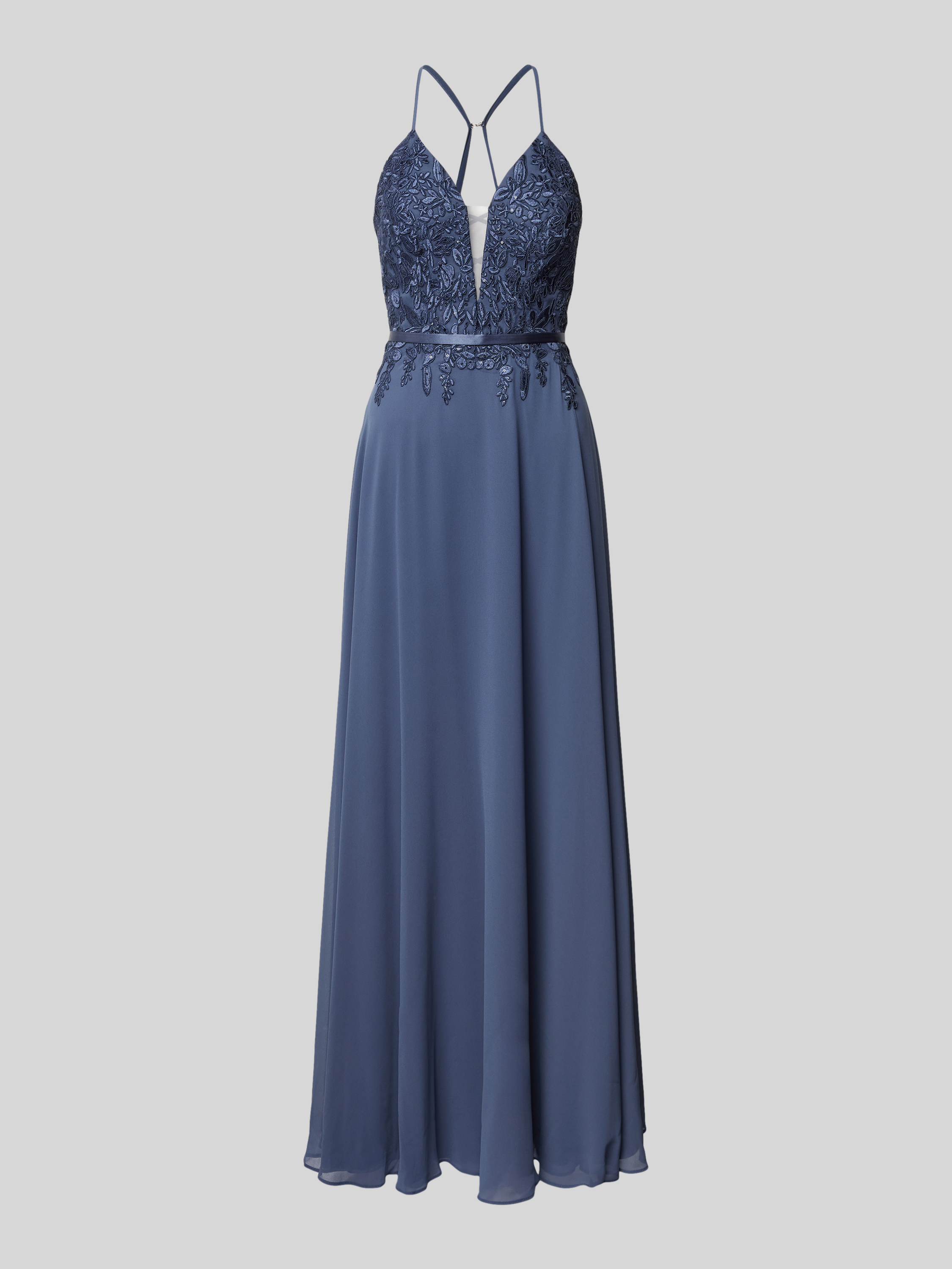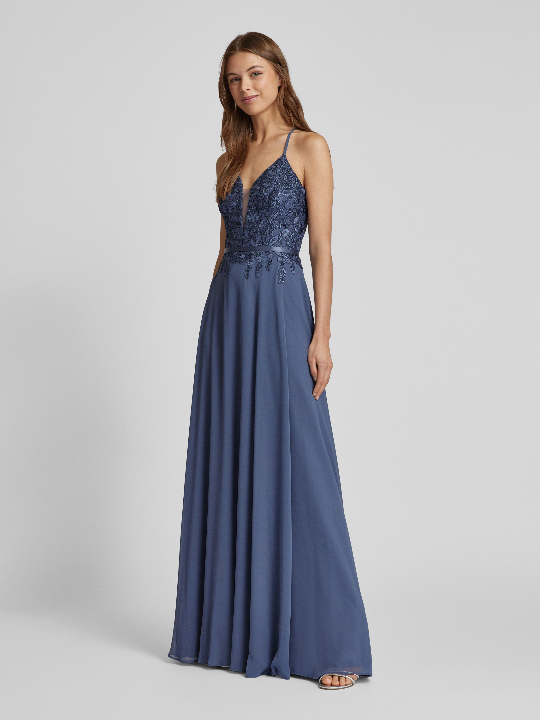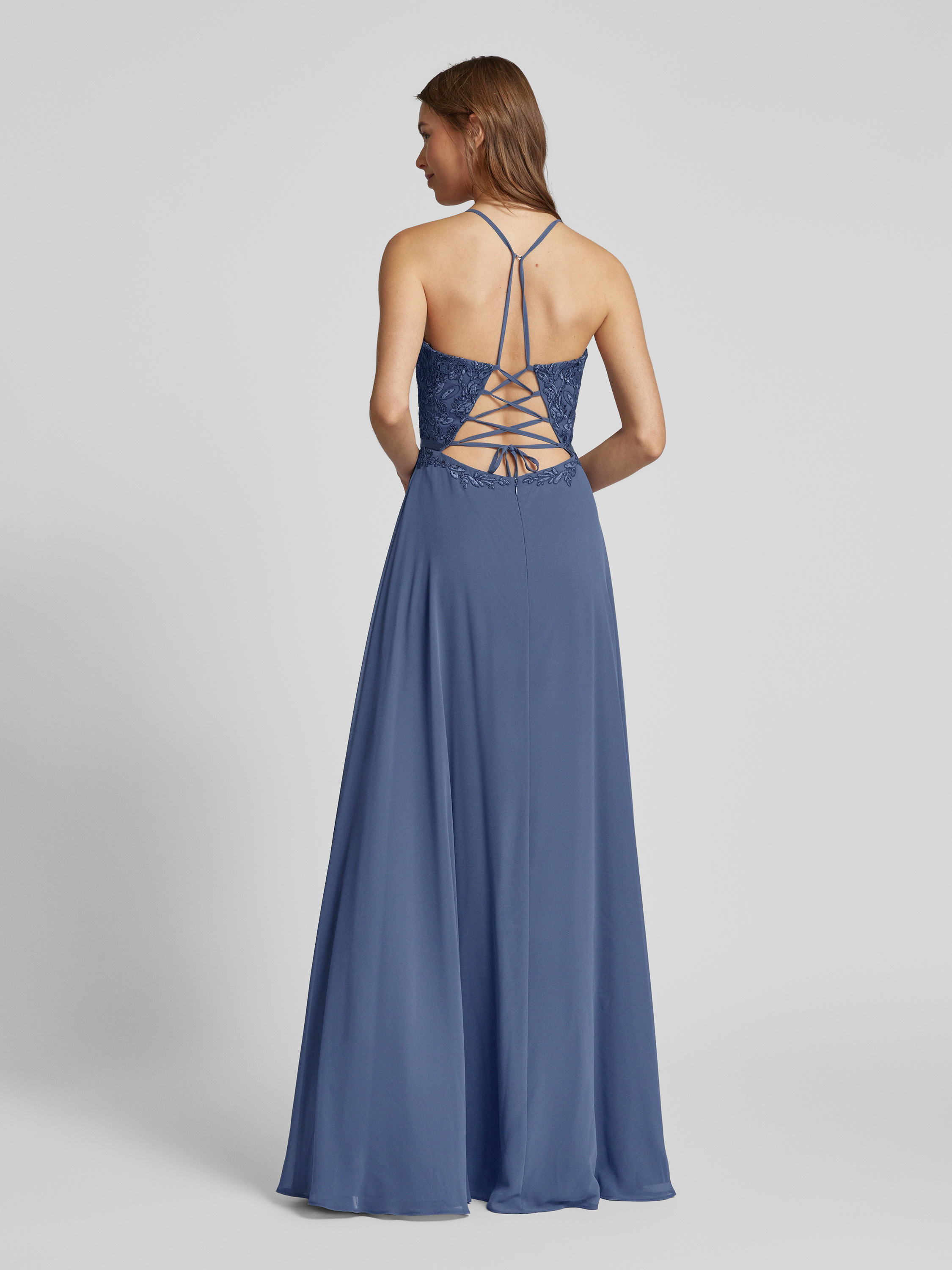 Das Abendkleid mit Häkelspitze von V.M. by Vera Mont zeichnet sich durch einen fließenden Chiffon und eine körpernahe Passform aus. Feine Spaghettiträger und der sanft geschwungene Herz-Ausschnitt sorgen für eine feminine Silhouette, während die Taillenpasse dezent akzentuiert. Durch den Beinschlitz erhält das Maxikleid einen eleganten Schwung, der Bewegungsfreiheit ermöglicht.