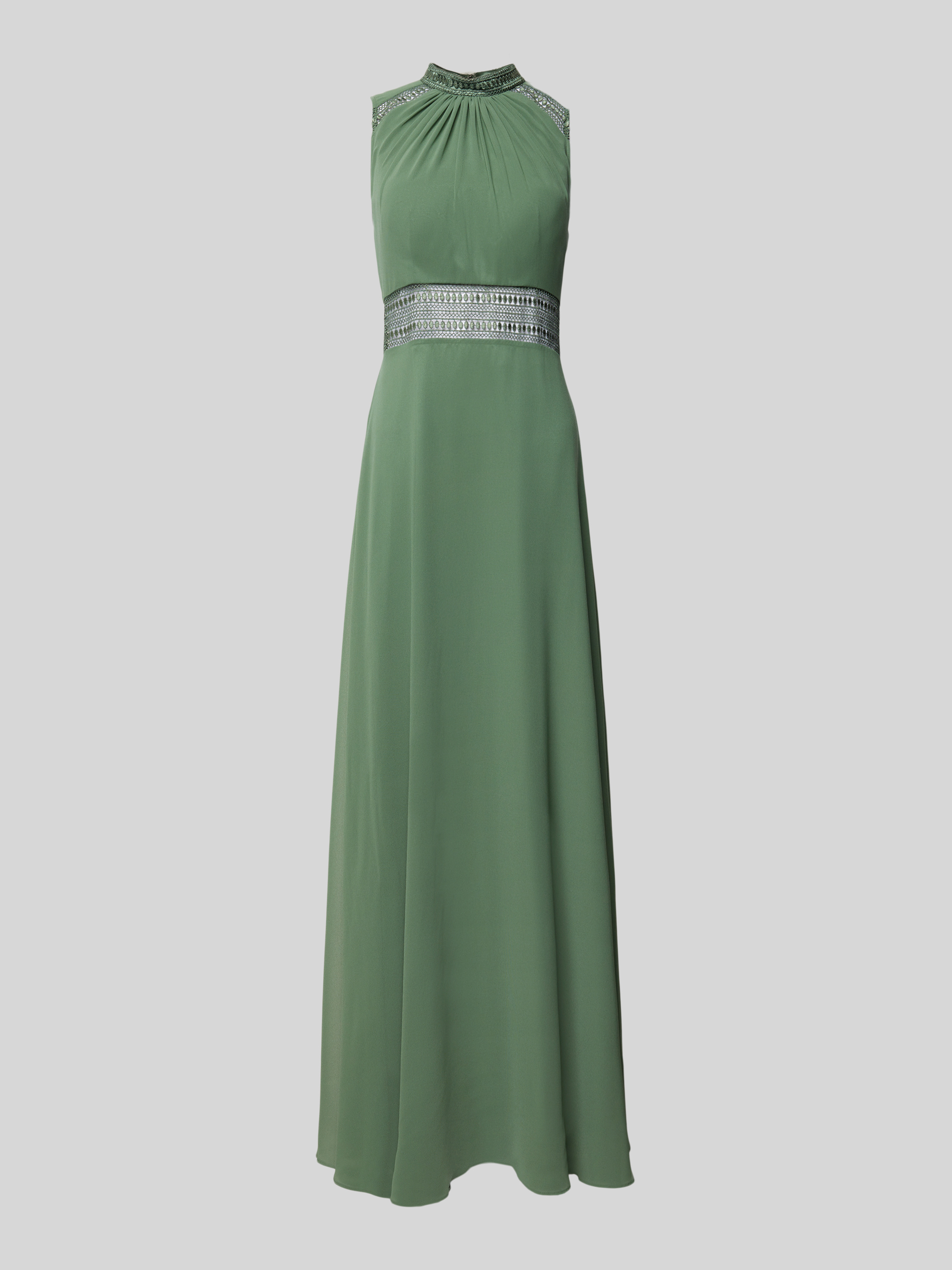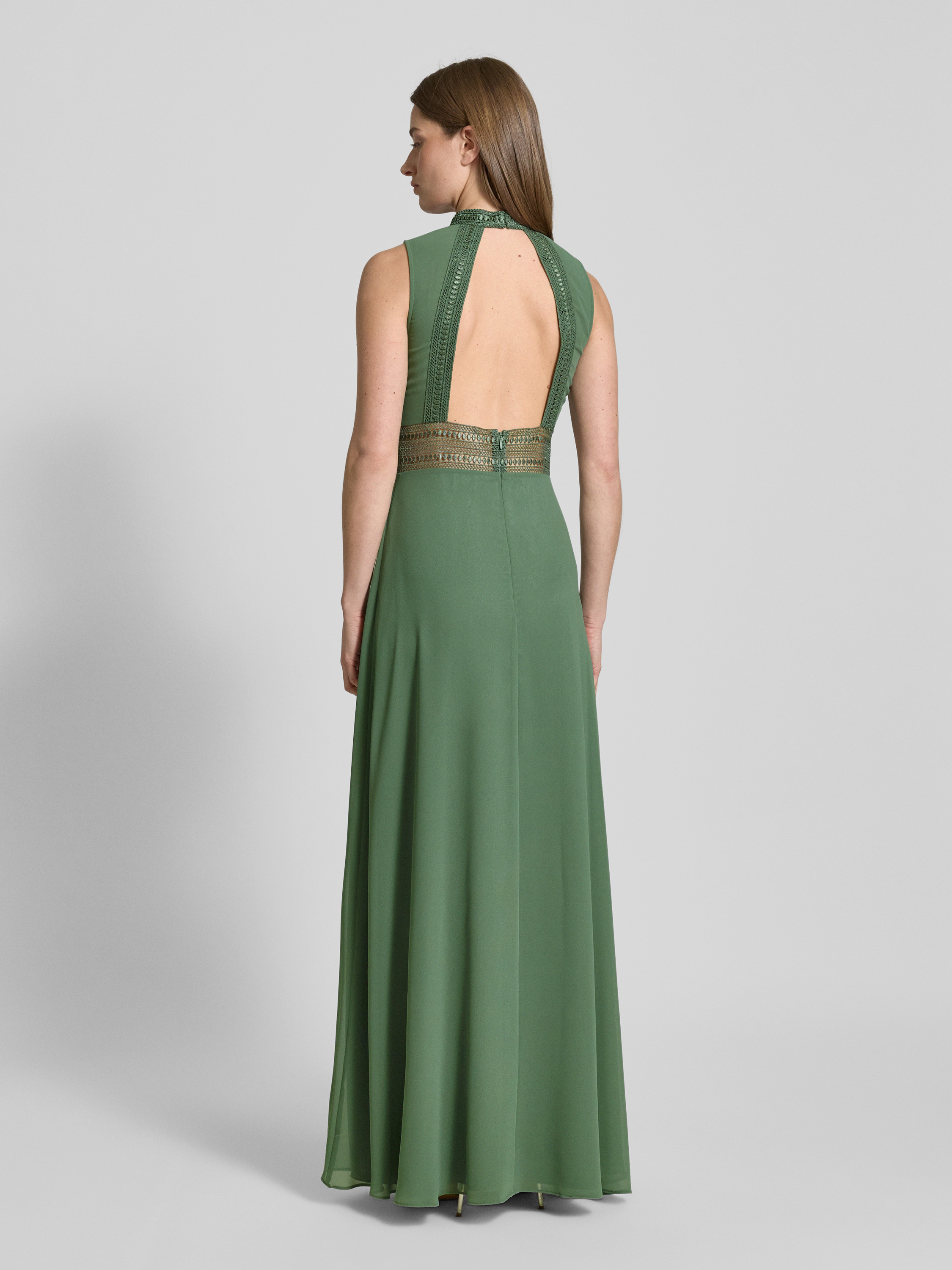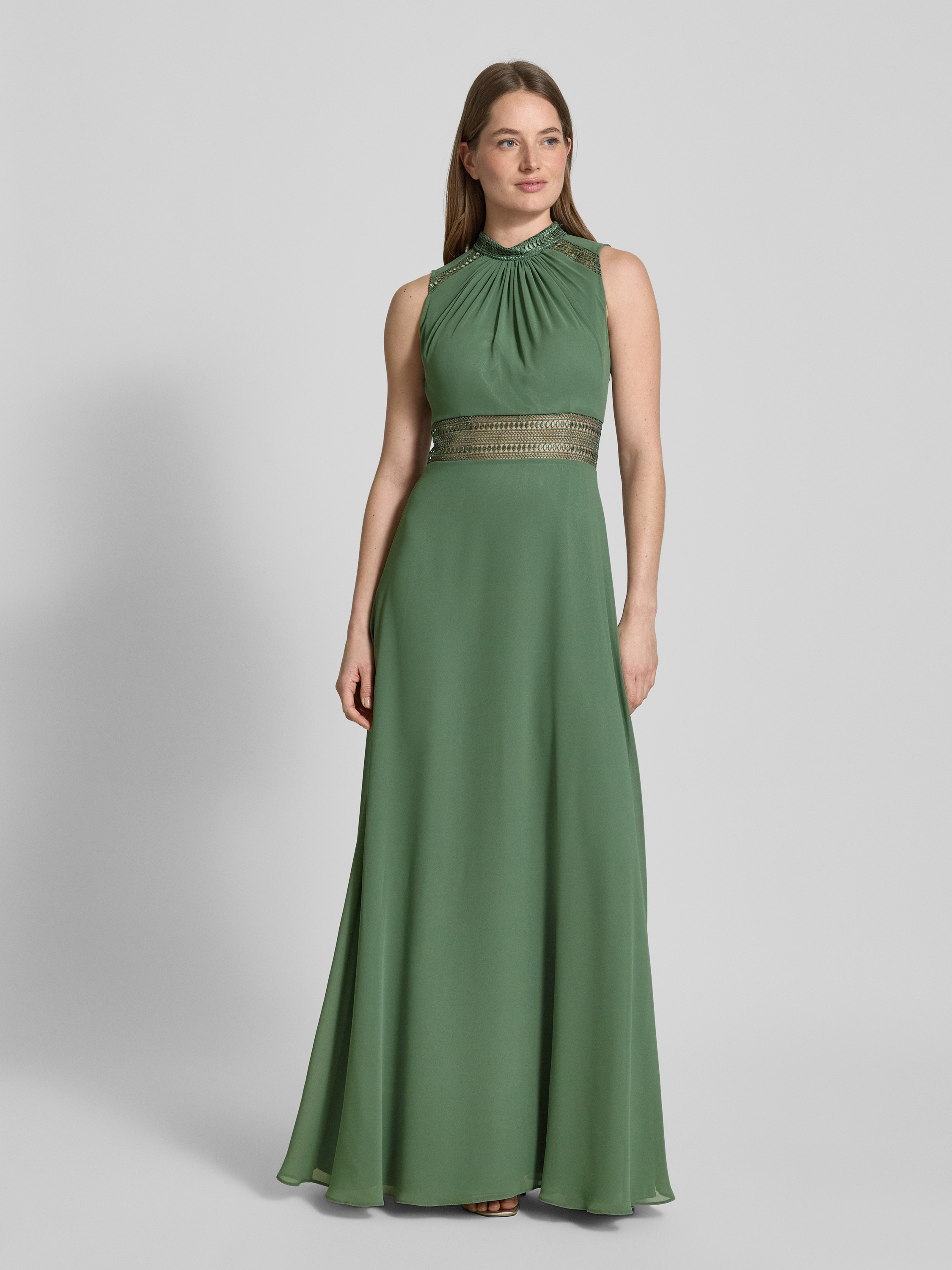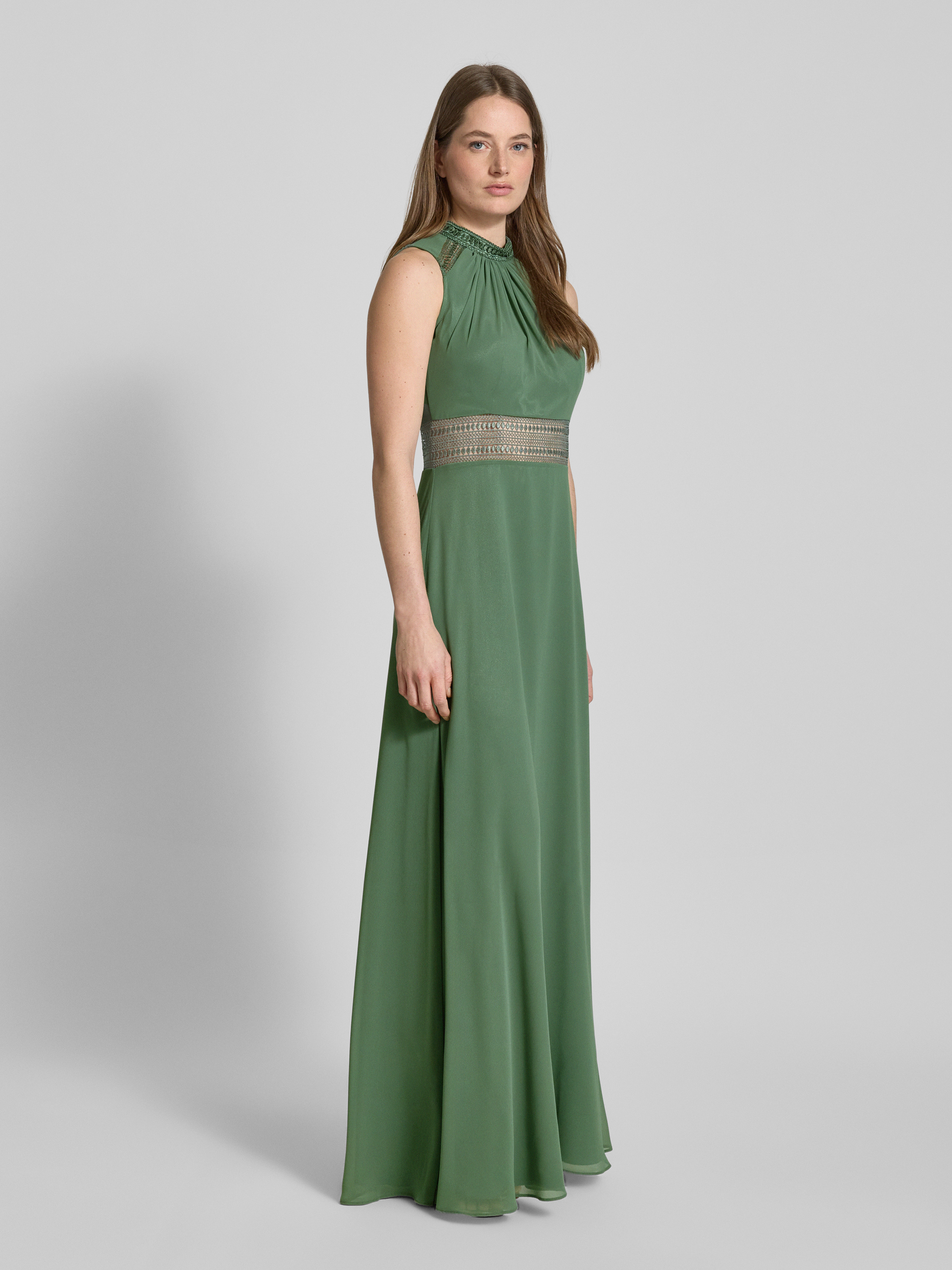 Das Abendkleid von V.M. by Vera Mont aus fließendem Chiffon präsentiert sich in einem leicht taillierten Schnitt, der die Figur sanft umspielt. Der elegante Stehkragen und die gelegten Falten verleihen dem Maxikleid eine besondere Note. Ein Cut-Out auf der Rückseite sorgt für einen raffinierten Akzent.