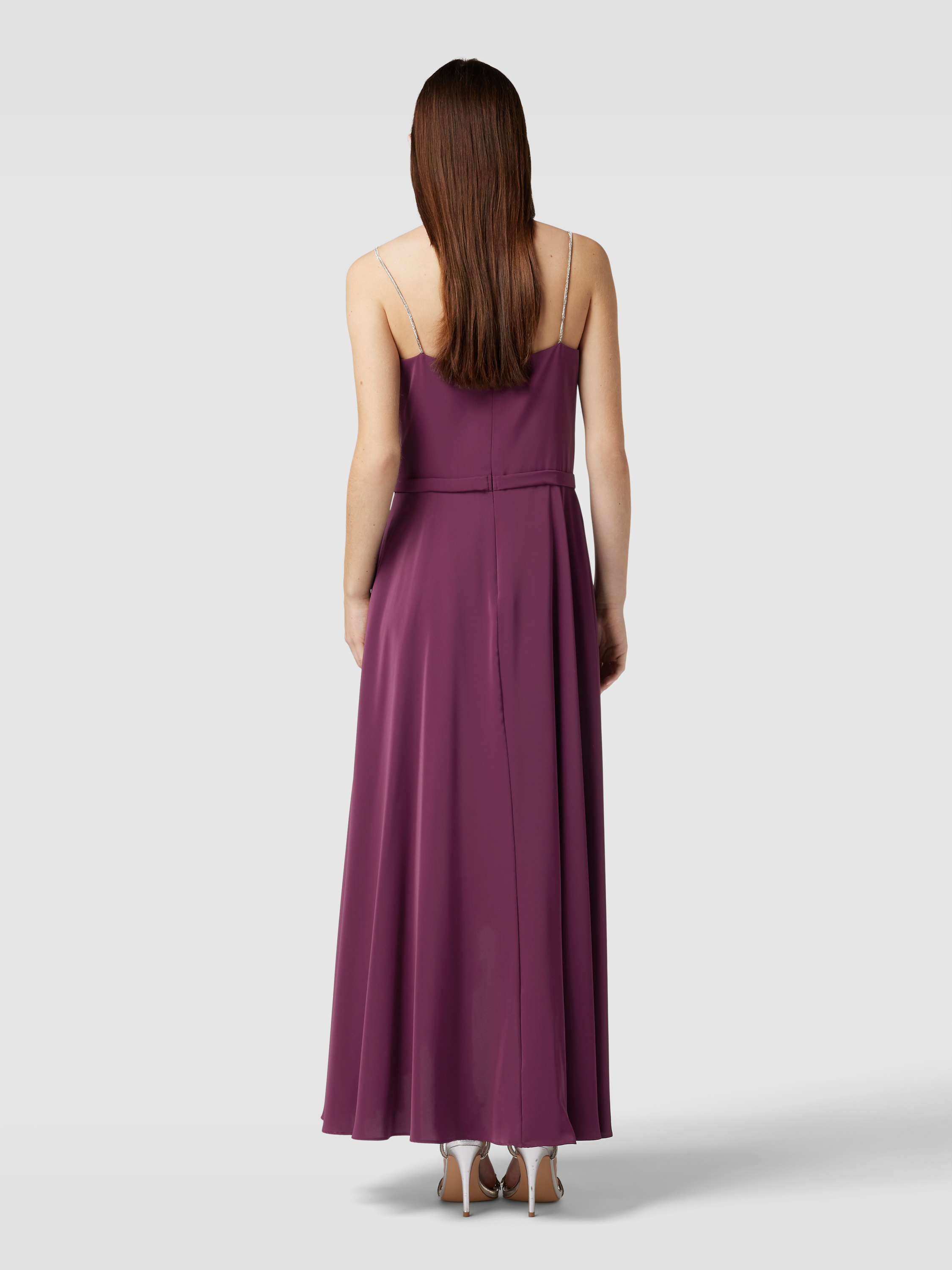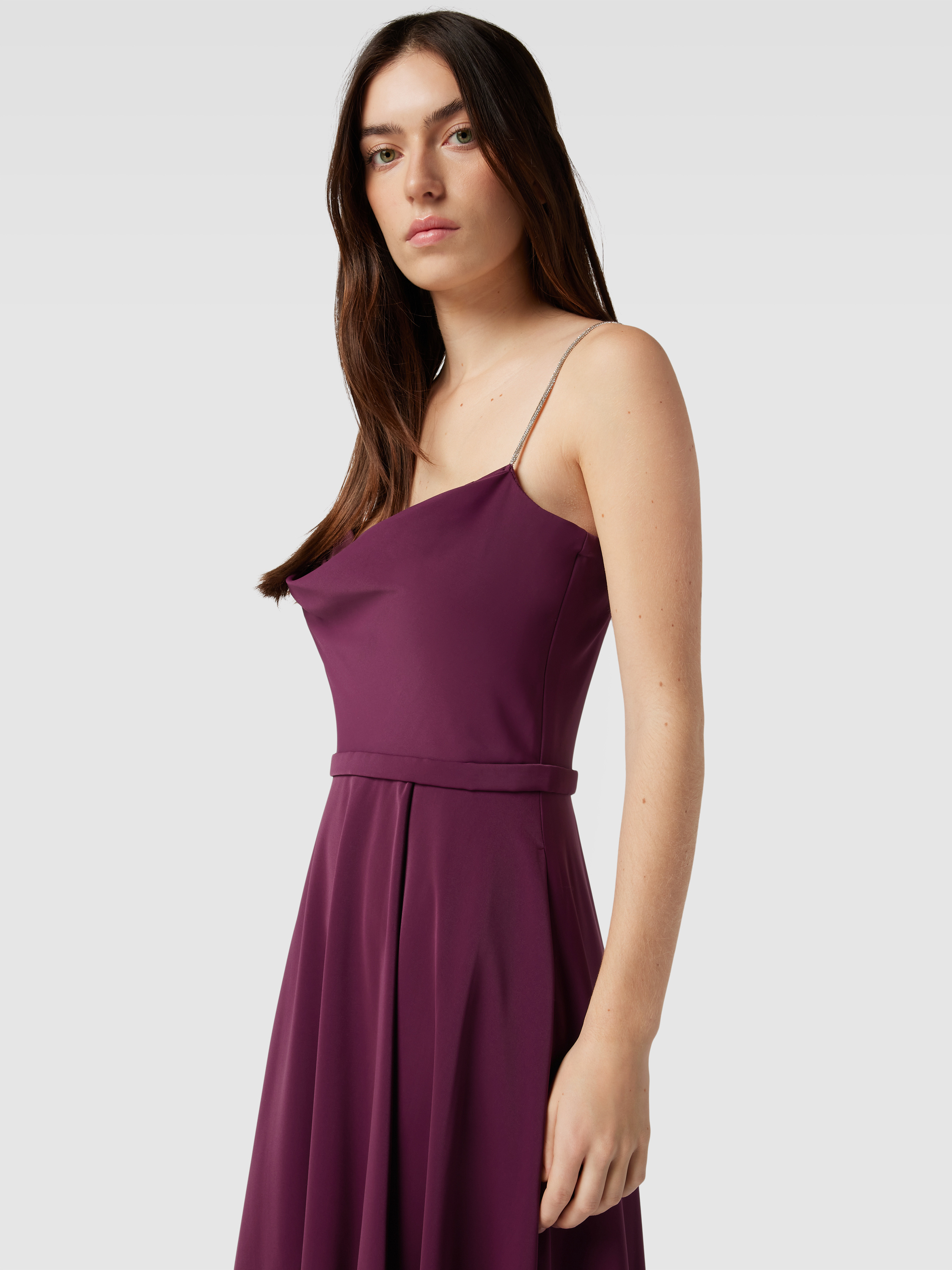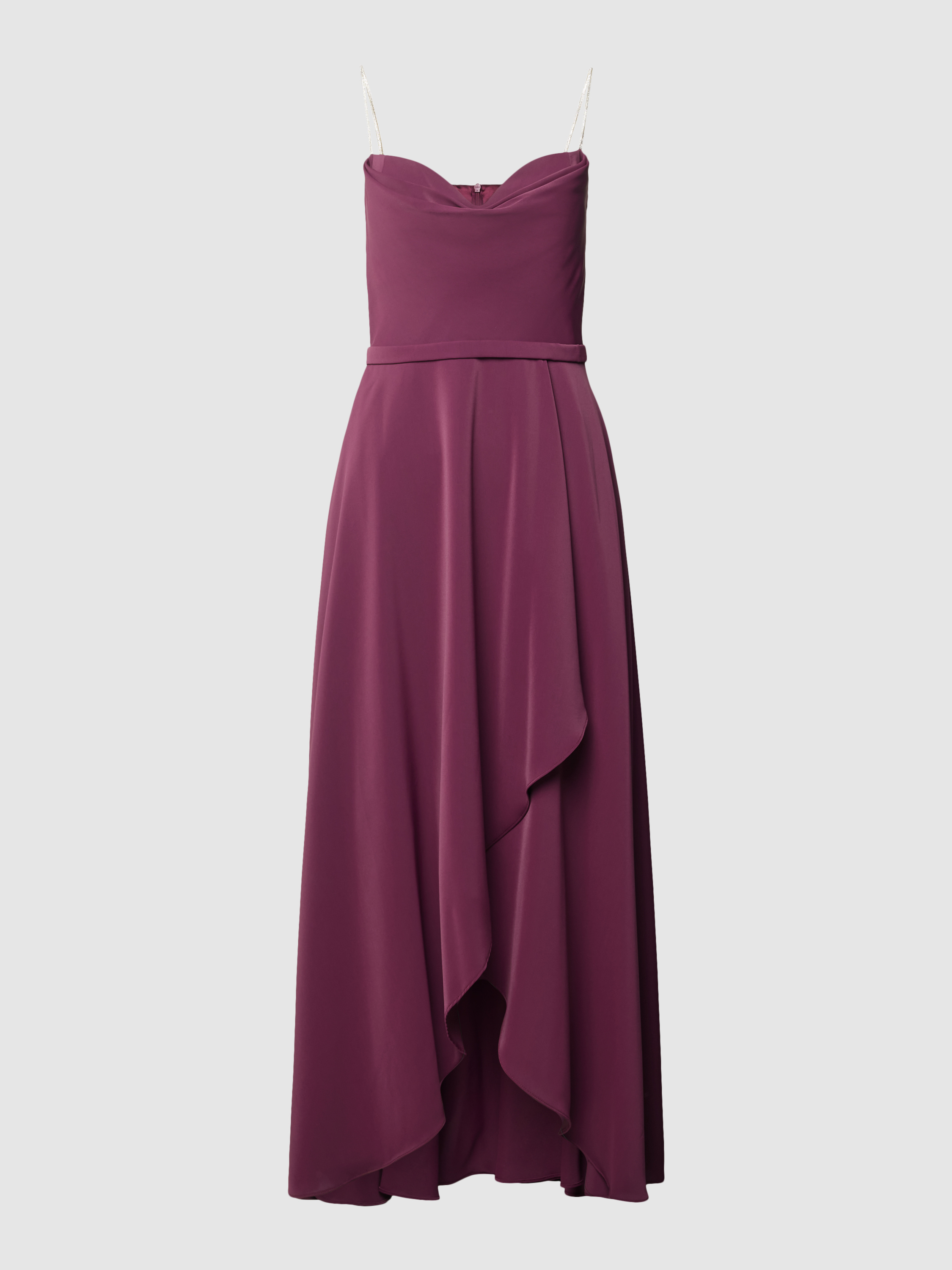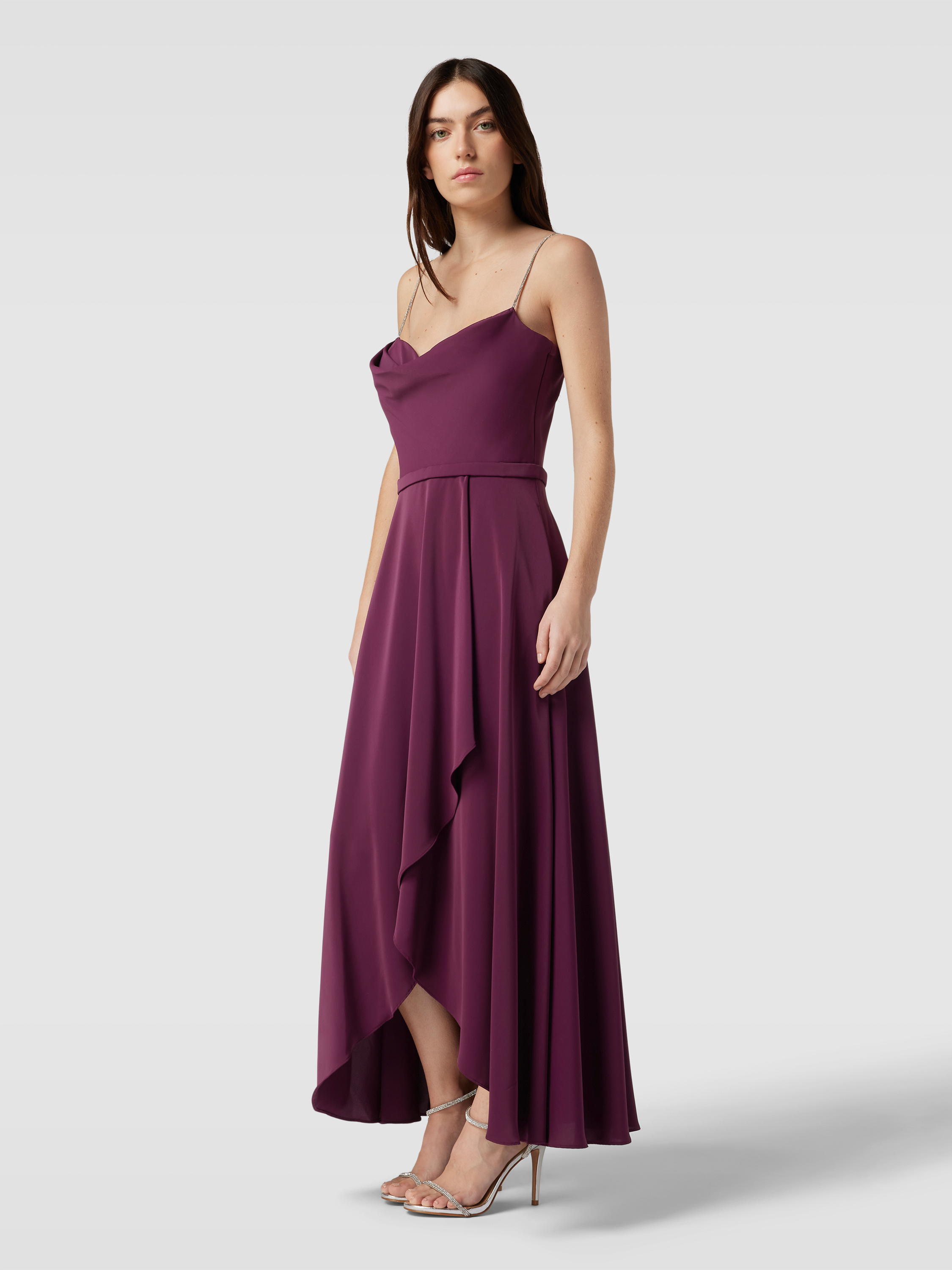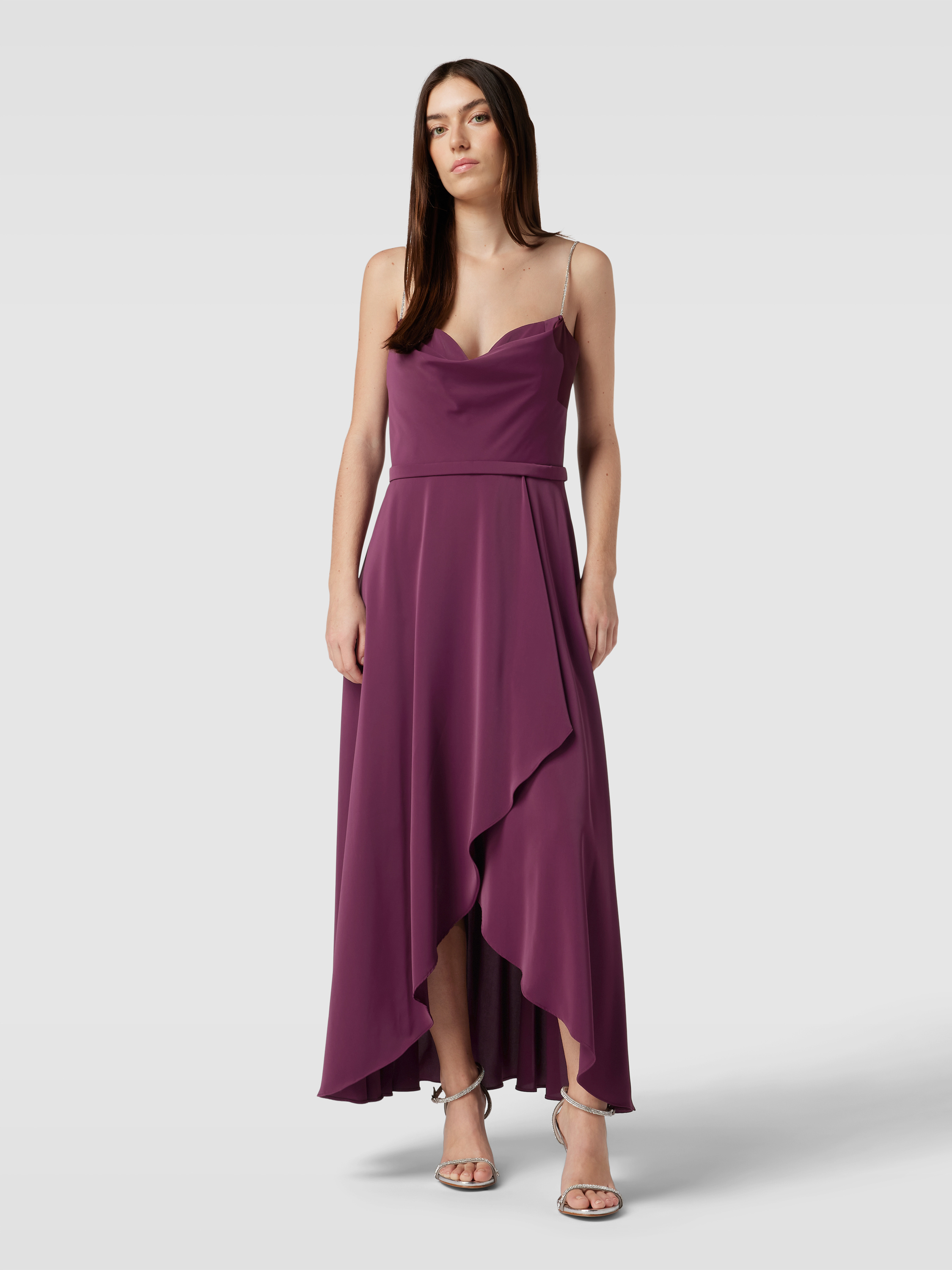 Das elegante Abendkleid von V.M. by Vera Mont aus fließendem Chiffon vereint eine schmeichelhafte A-Linie mit einem raffinierten Wasserfall-Ausschnitt. Die Wickel-Optik und das Taillenband akzentuieren die Silhouette, während Spaghetti-Träger für eine luftige Leichtigkeit sorgen. Ideal für besondere Anlässe.