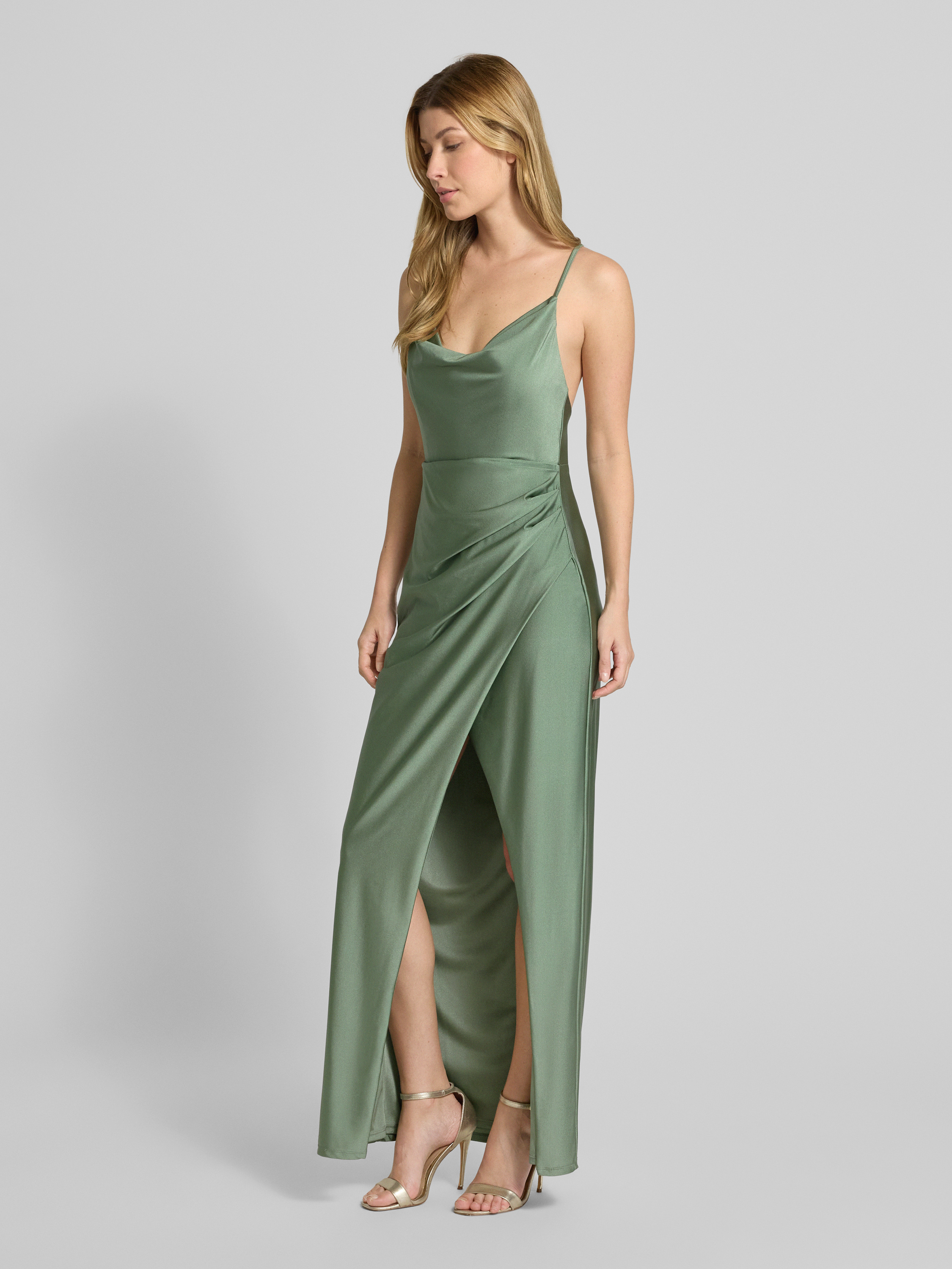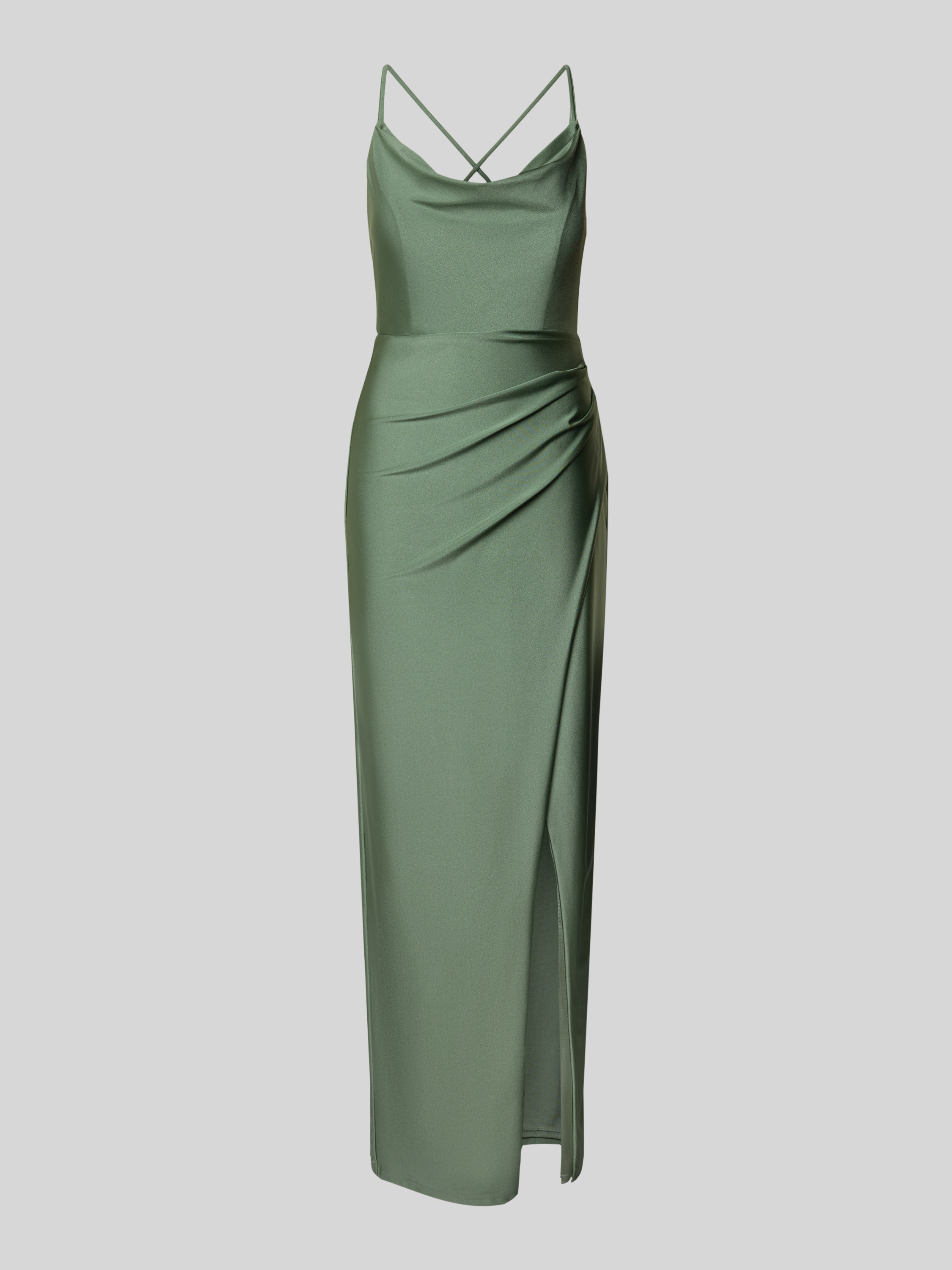 V.M.Abendkleid mit Wasserfall-Ausschnitt und Gehschlitz in hellgruen