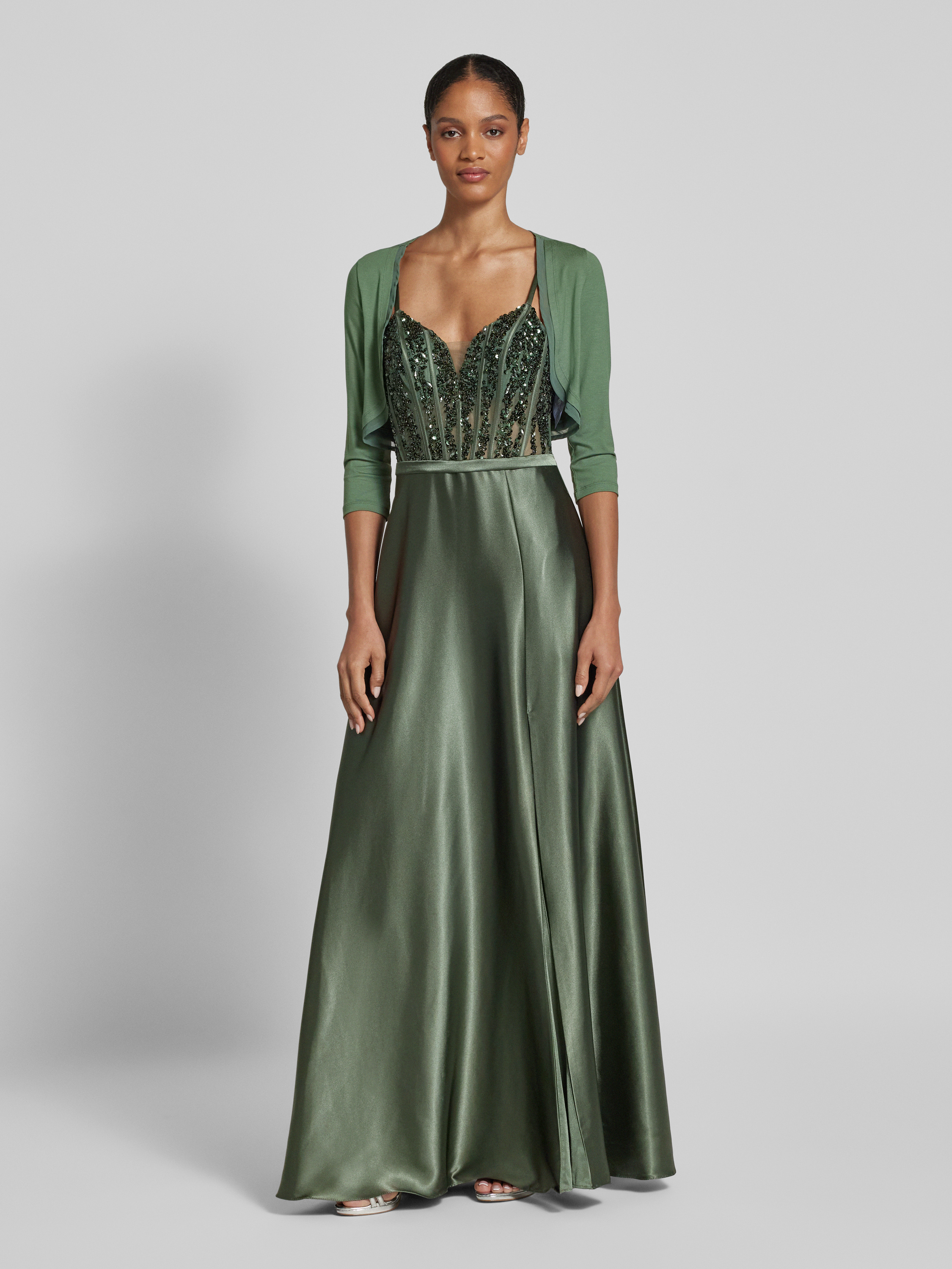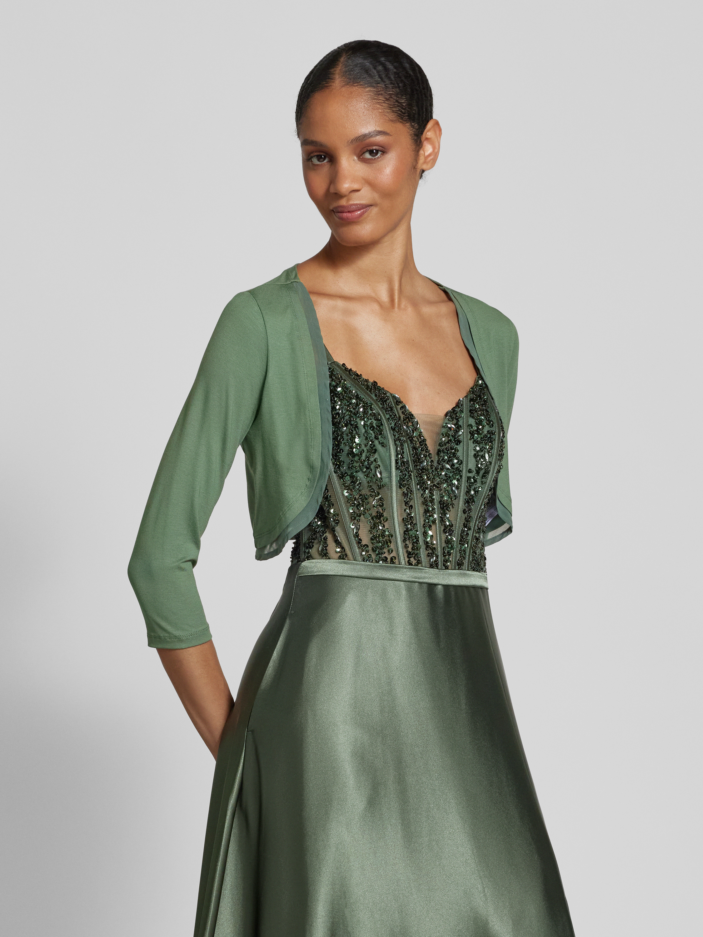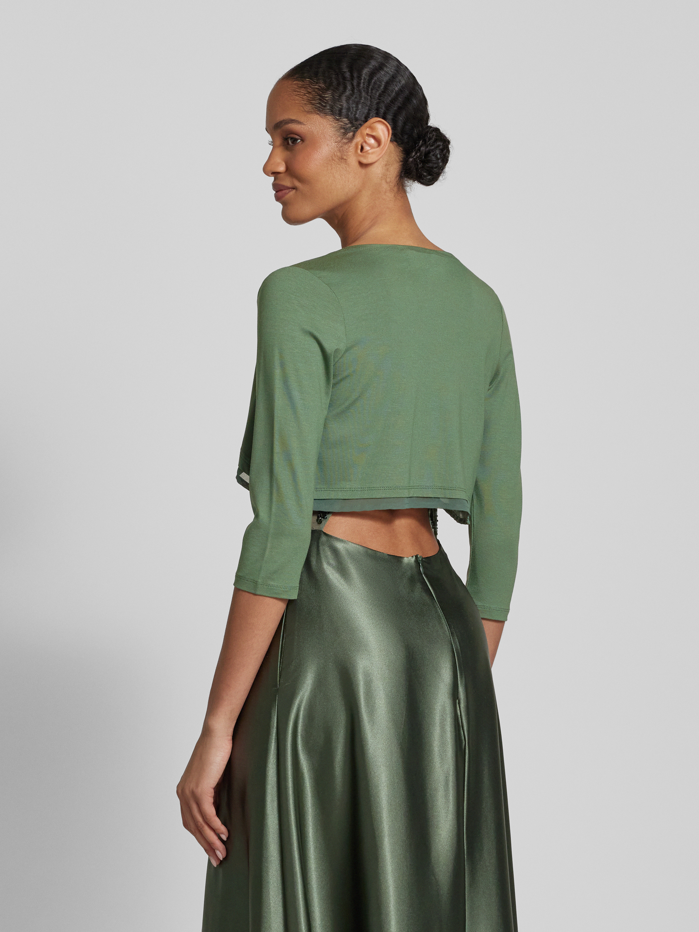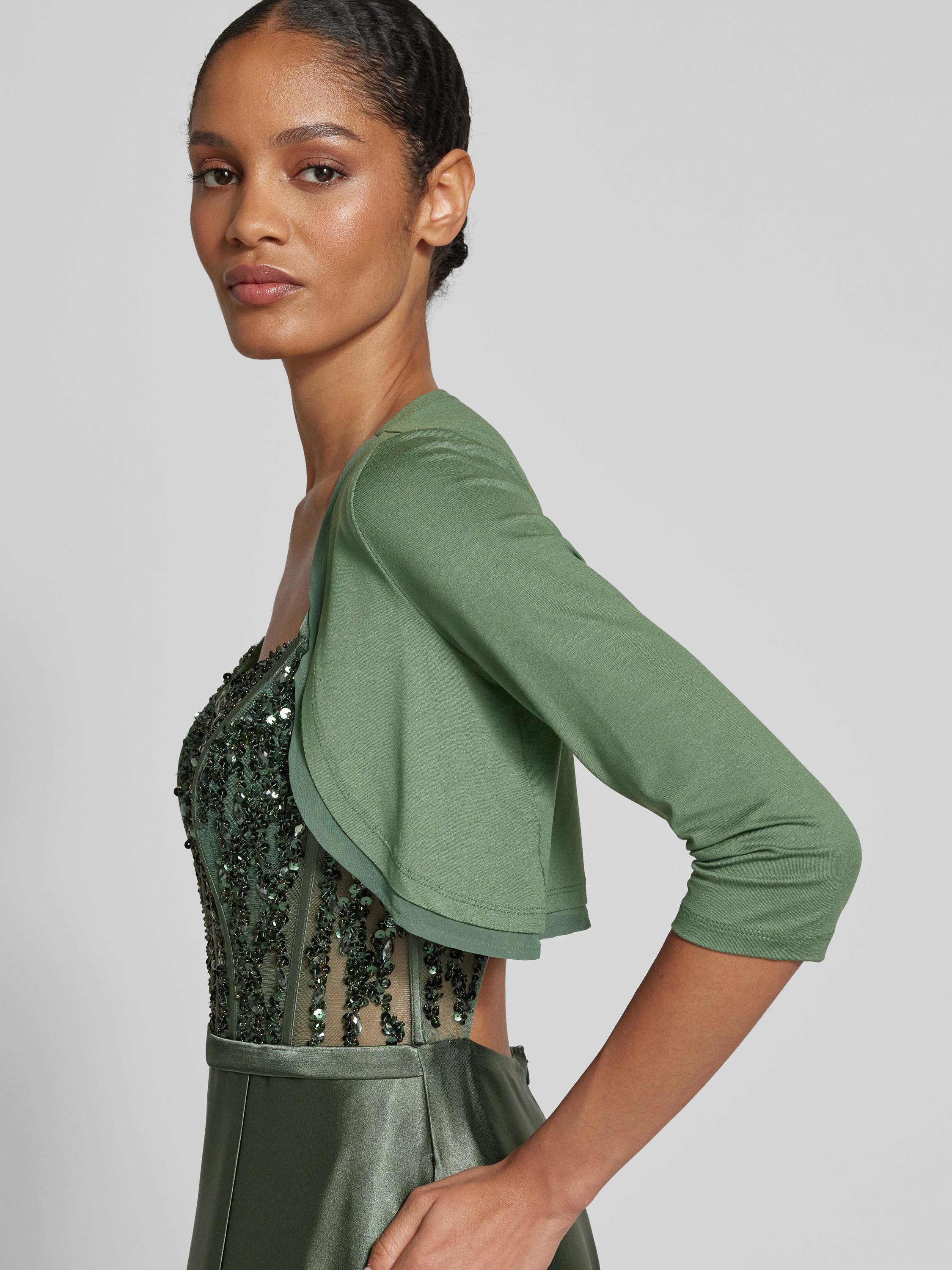 Der Bolero von VM Vera Mont ist aus einem geschmeidigen Viskose-Elasthan-Mix gefertigt, der sich angenehm an den Körper schmiegt. Der körpernahe Schnitt und die offene Vorderseite verleihen dem Kleidungsstück eine elegante Note, die vielseitig kombinierbar ist. Ideal für verschiedenste Anlässe.