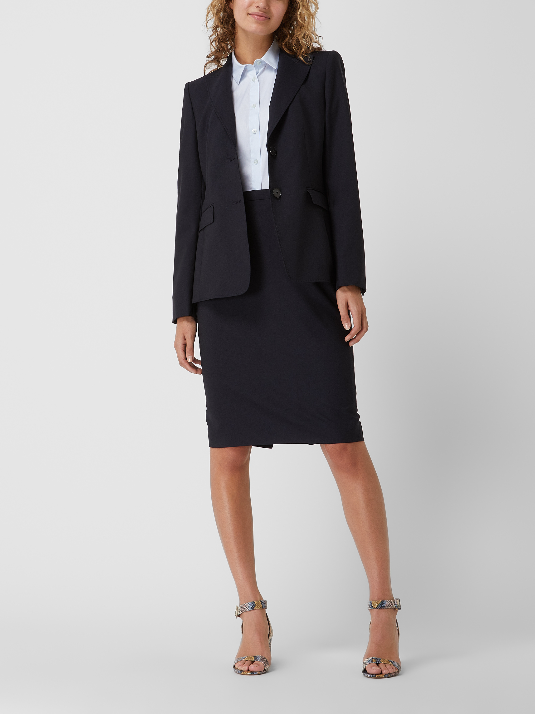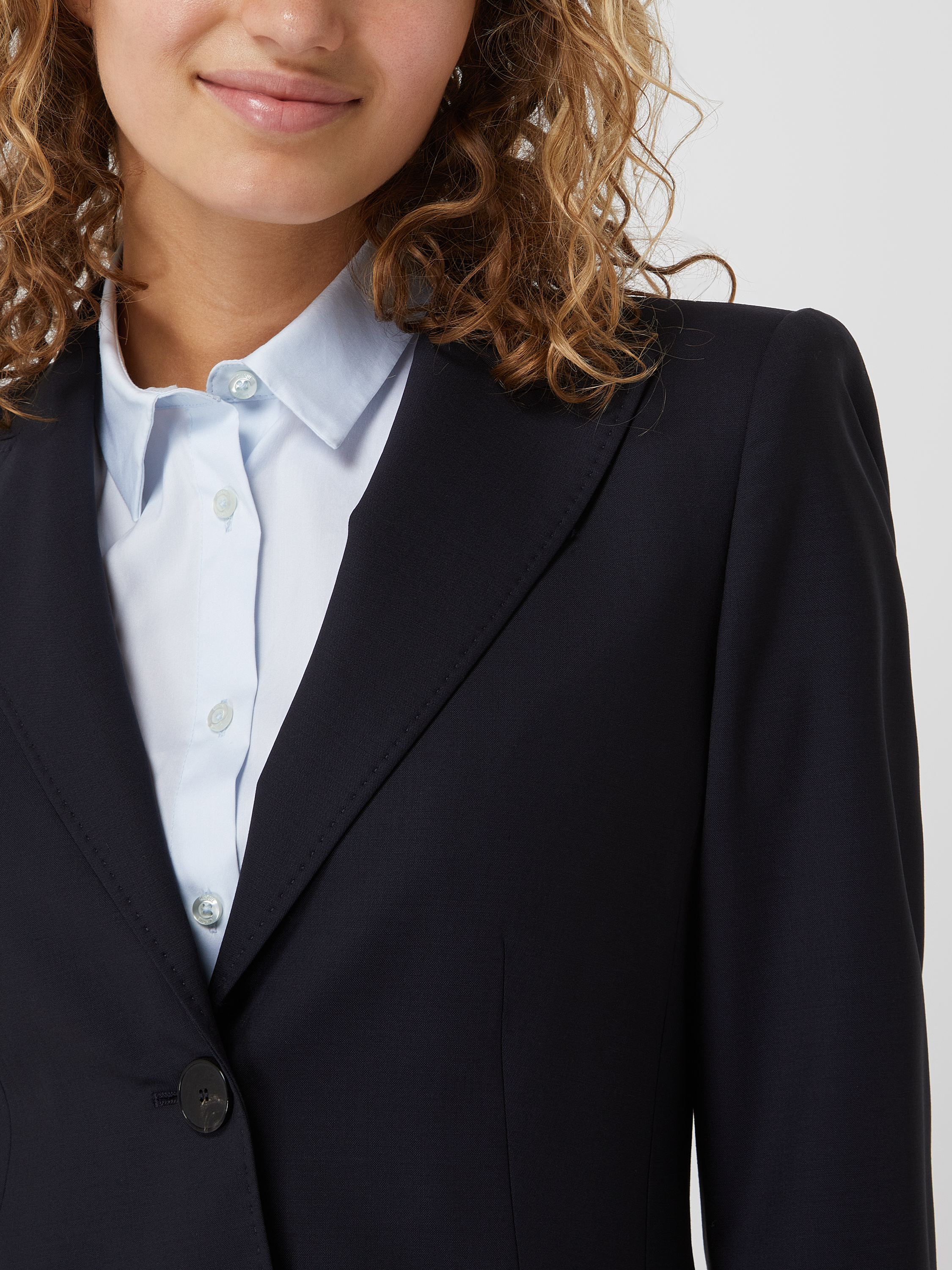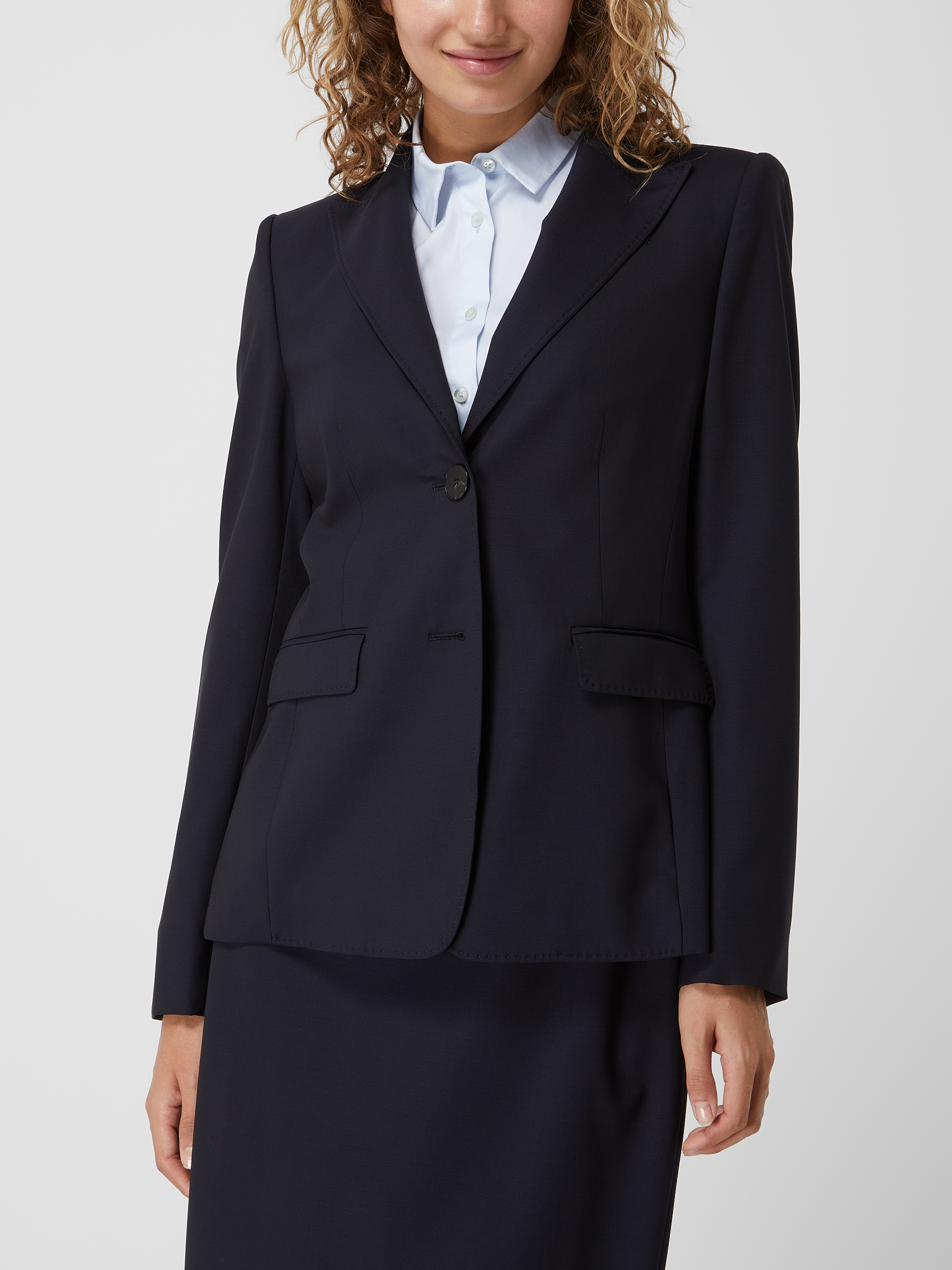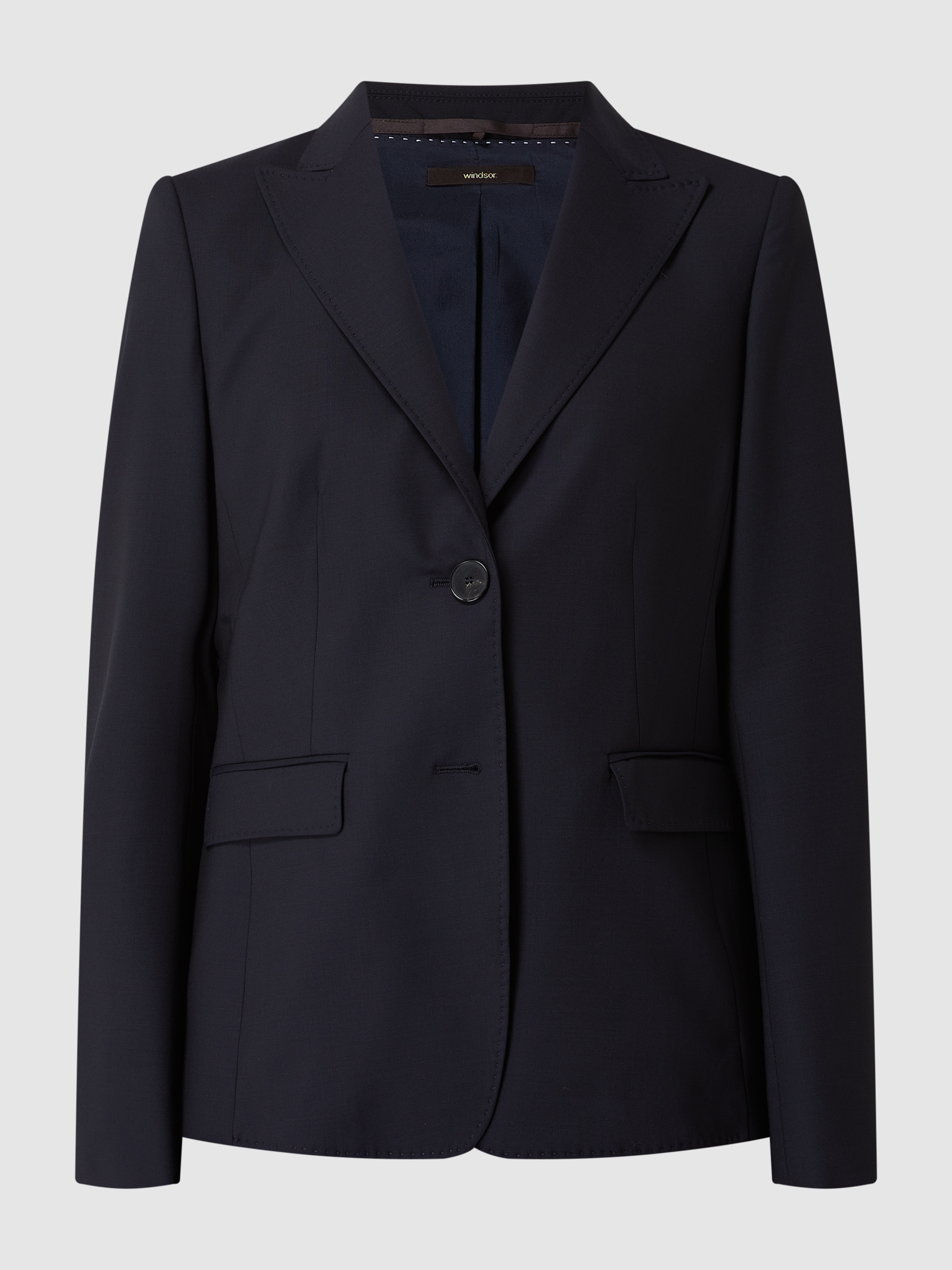 Der Blazer von Windsor ist aus einem Schurwoll-Elasthan-Mix gefertigt. Er kommt in taillierter Passform mit Reverskragen, 2-Knopf-Leiste und Schulterpads.