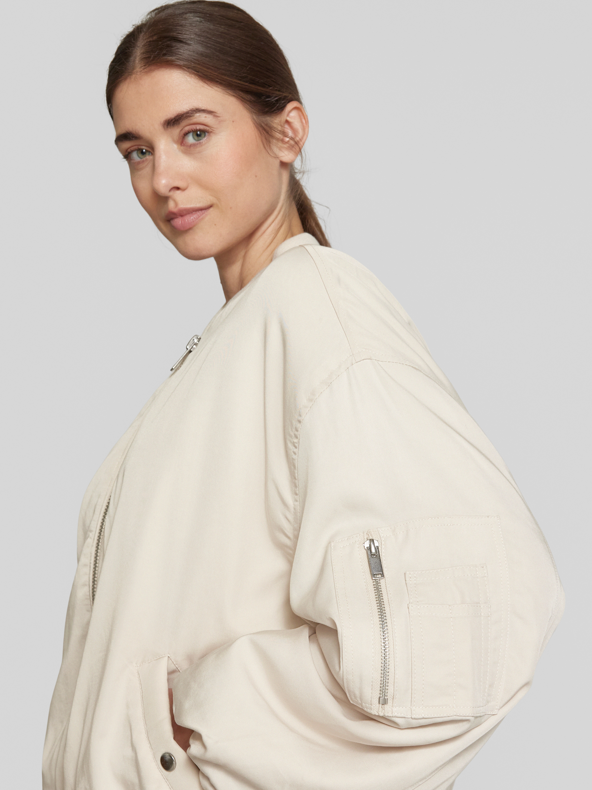 Die Damen Bomberjacke von WithBlack vereint lässigen Stil mit Funktionalität. Gefertigt aus einem Lyocell-Mix, sorgt sie für ein angenehmes Tragegefühl, während der Regular Fit eine bequeme Passform bietet. Praktische Taschen am Ärmel und an der Seite runden das Design ab.