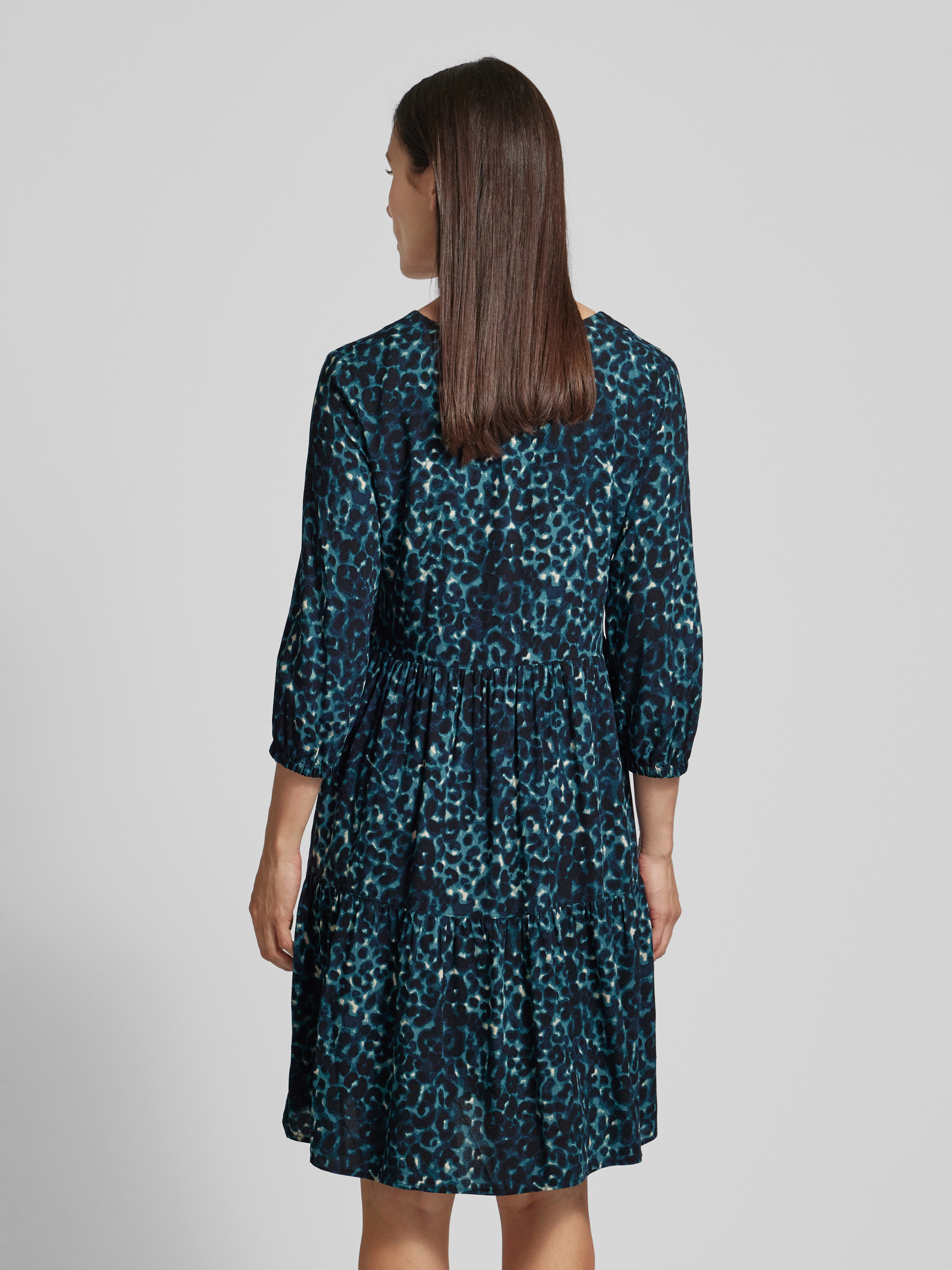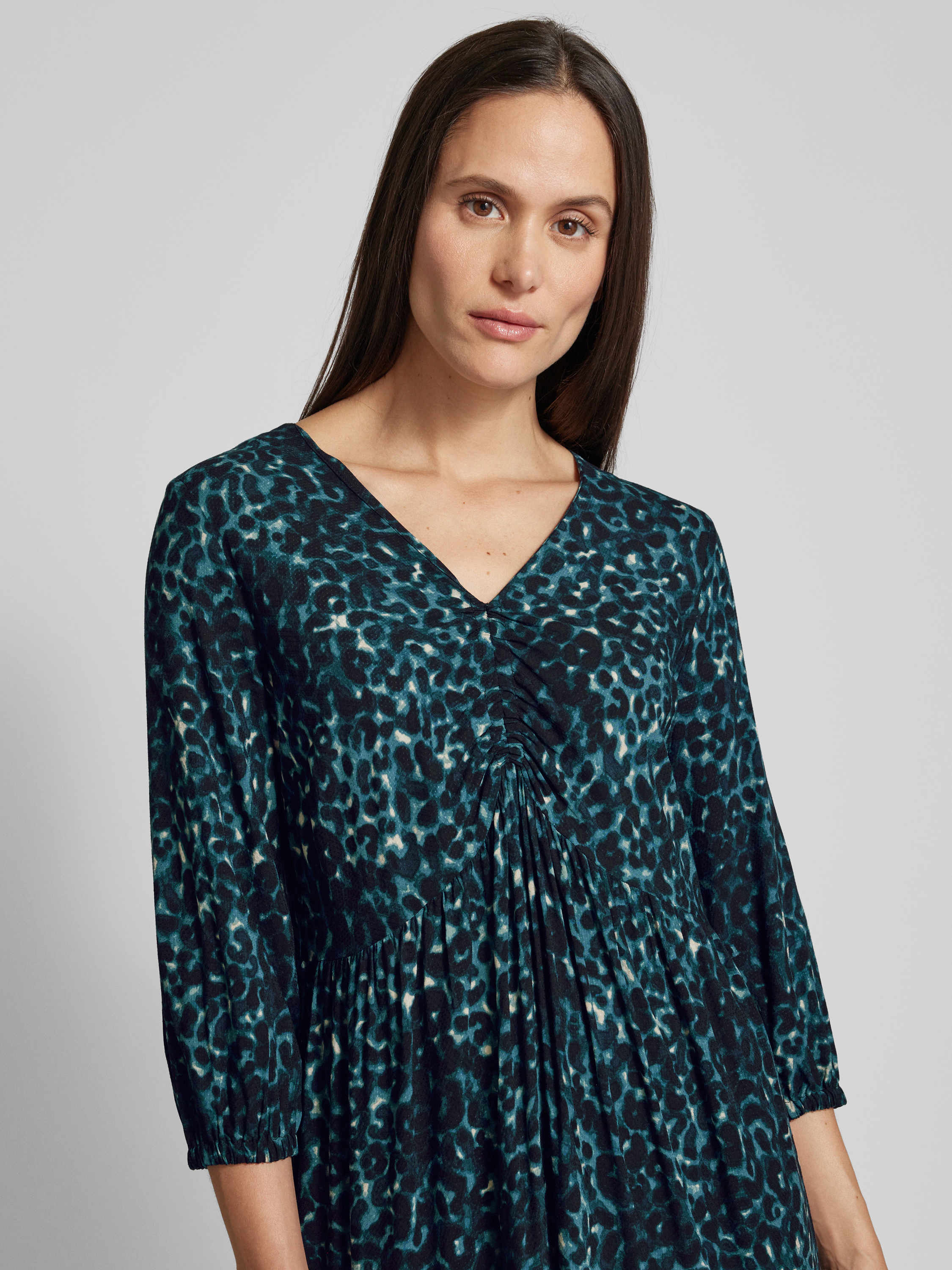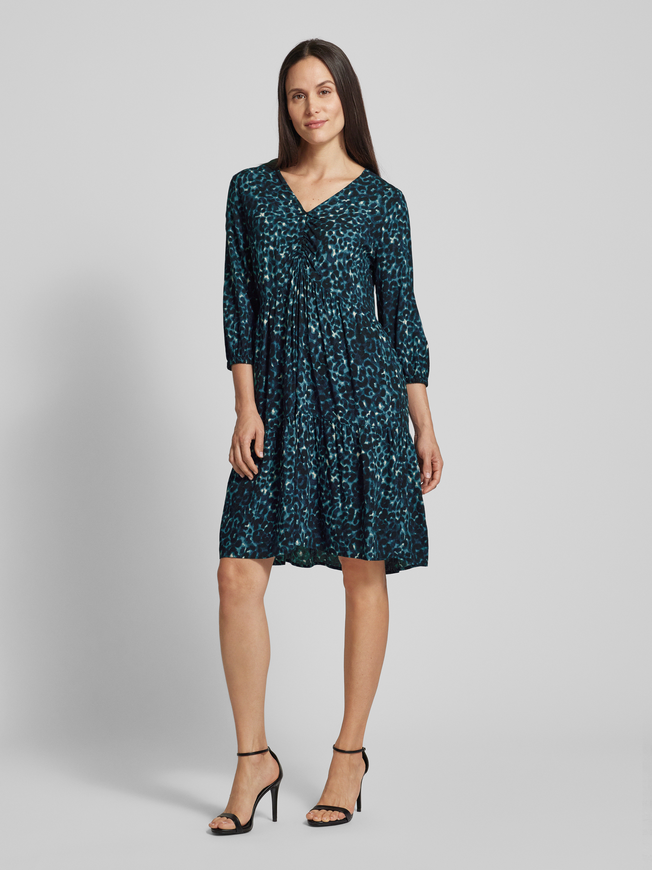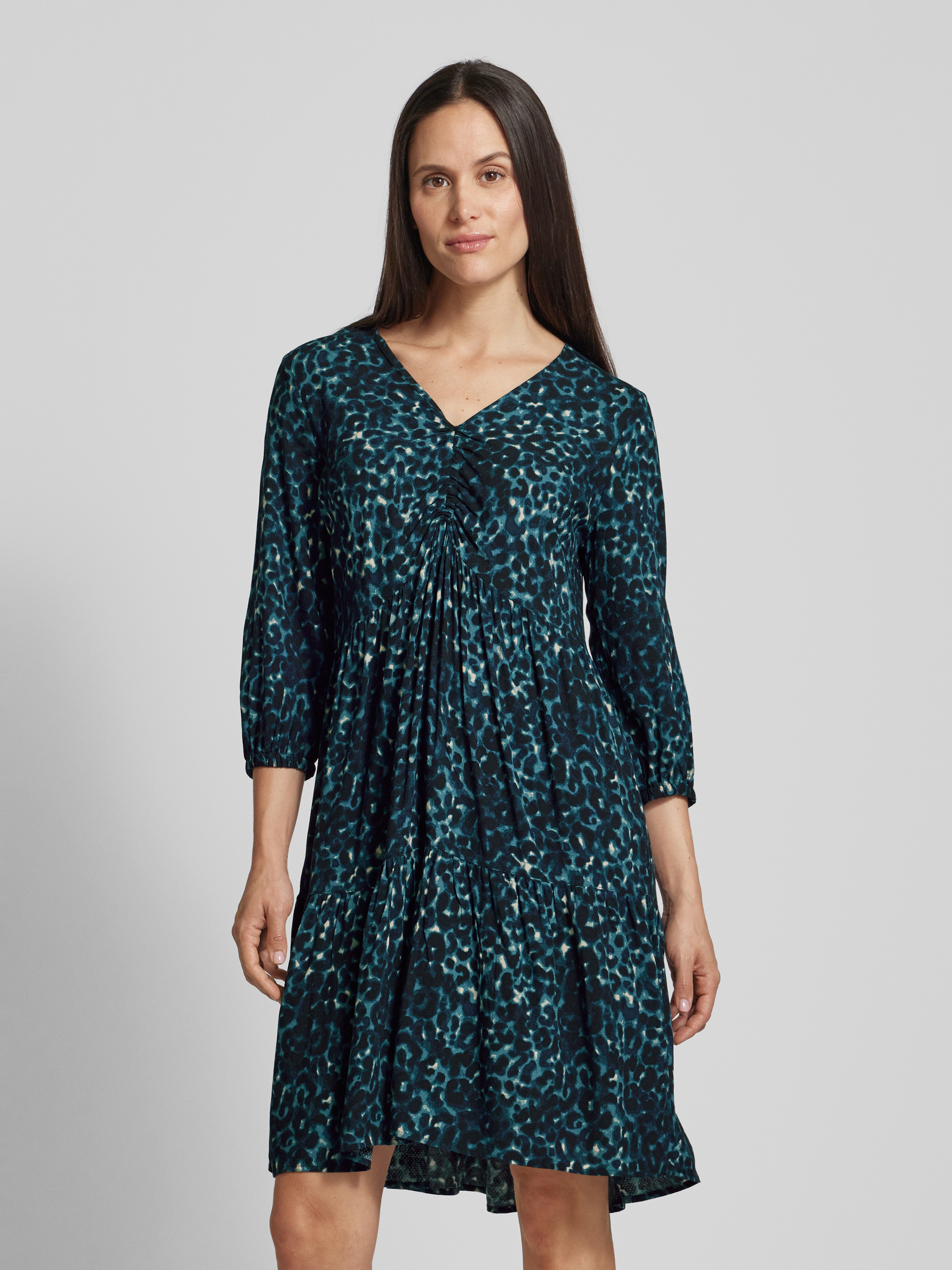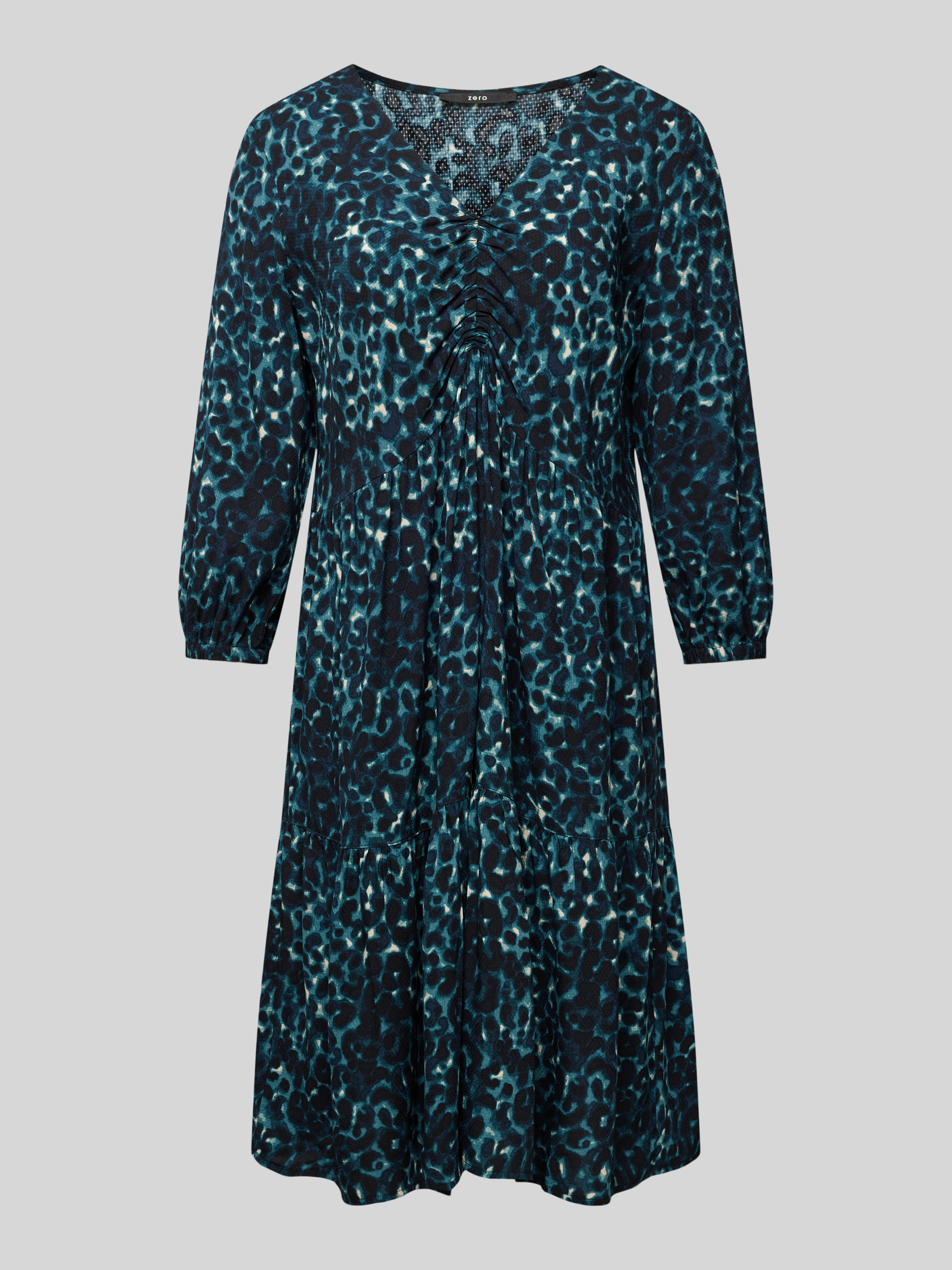 Das knielange Kleid von zero, gefertigt aus reiner Viskose, besticht durch seinen geraden Schnitt und den eleganten V-Ausschnitt. Raffungen und der Stufen-Look verleihen ihm eine besondere Note, während die 3/4-Ärmel angenehm leicht wirken. Ideal für vielseitige Anlässe.