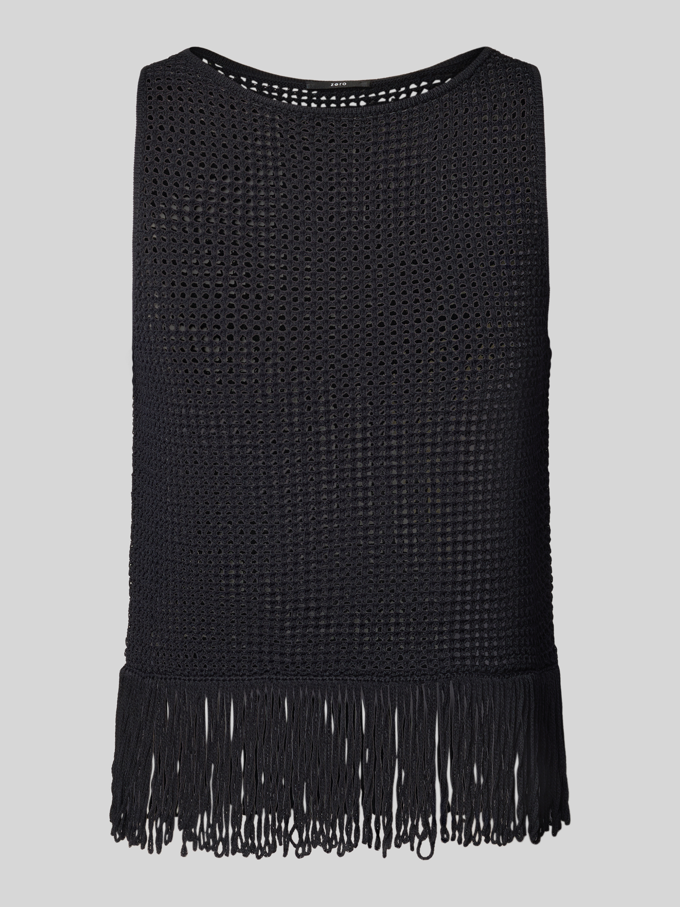 Das Stricktop von Zero bietet durch seinen Viskose-Mix einen angenehmen Tragekomfort und lässt dank seiner semitransparenten Struktur spannende Einblicke zu. Der Regular Fit sorgt für eine lockere Passform, während die verspielten Fransen dem Outfit eine besondere Note verleihen. Ideal für vielseitige Kombinationen.